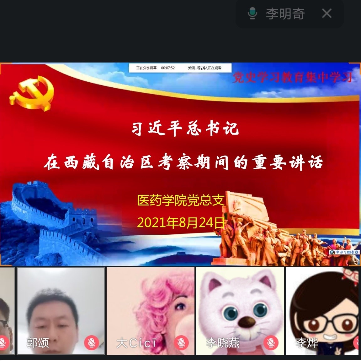 按照上级和学校党史学习教育领导小组的安排部署,8月24日下午,医药学院党总支组织全体党员利用QQ网络视频形式集中学习了习近平总书记在西藏自治区考察期间的重要讲话,党总支书记李明奇主持学习。