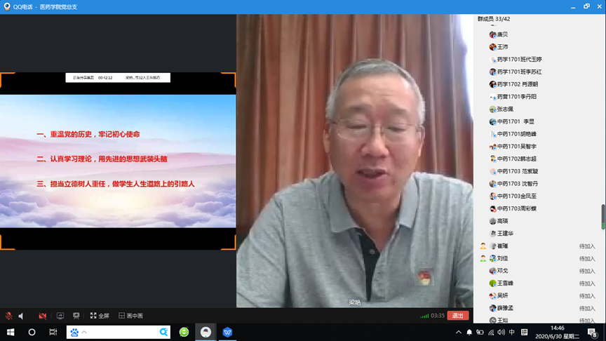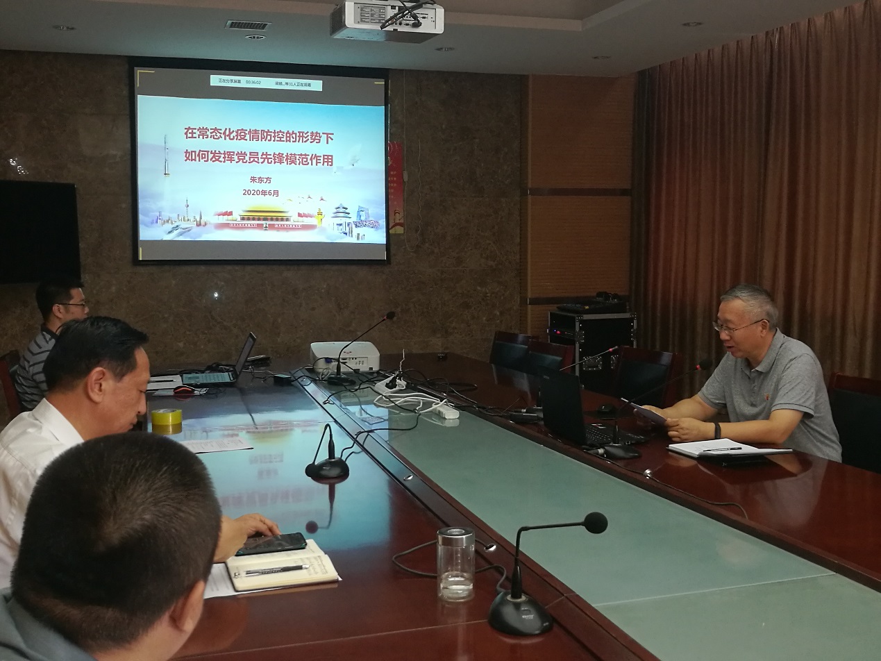 6月30日下午,在中国共产党成立99周年的生日前夕,根据学校基层党组织常态化疫情防控“四个一”行动的部署,学校党委副书记朱东方为医药学院全体党员讲授常态化疫情防控专题党课《在常态化疫情防控的形势下如何发挥党员先锋模范作用》。党课采取线上线下相结合的方式进行,医药学院党总支书记韩宝来、副书记梁艳以及其他支委委员在行政楼四楼第一会议室参加,学院其他党员通过腾讯会议收看直播。