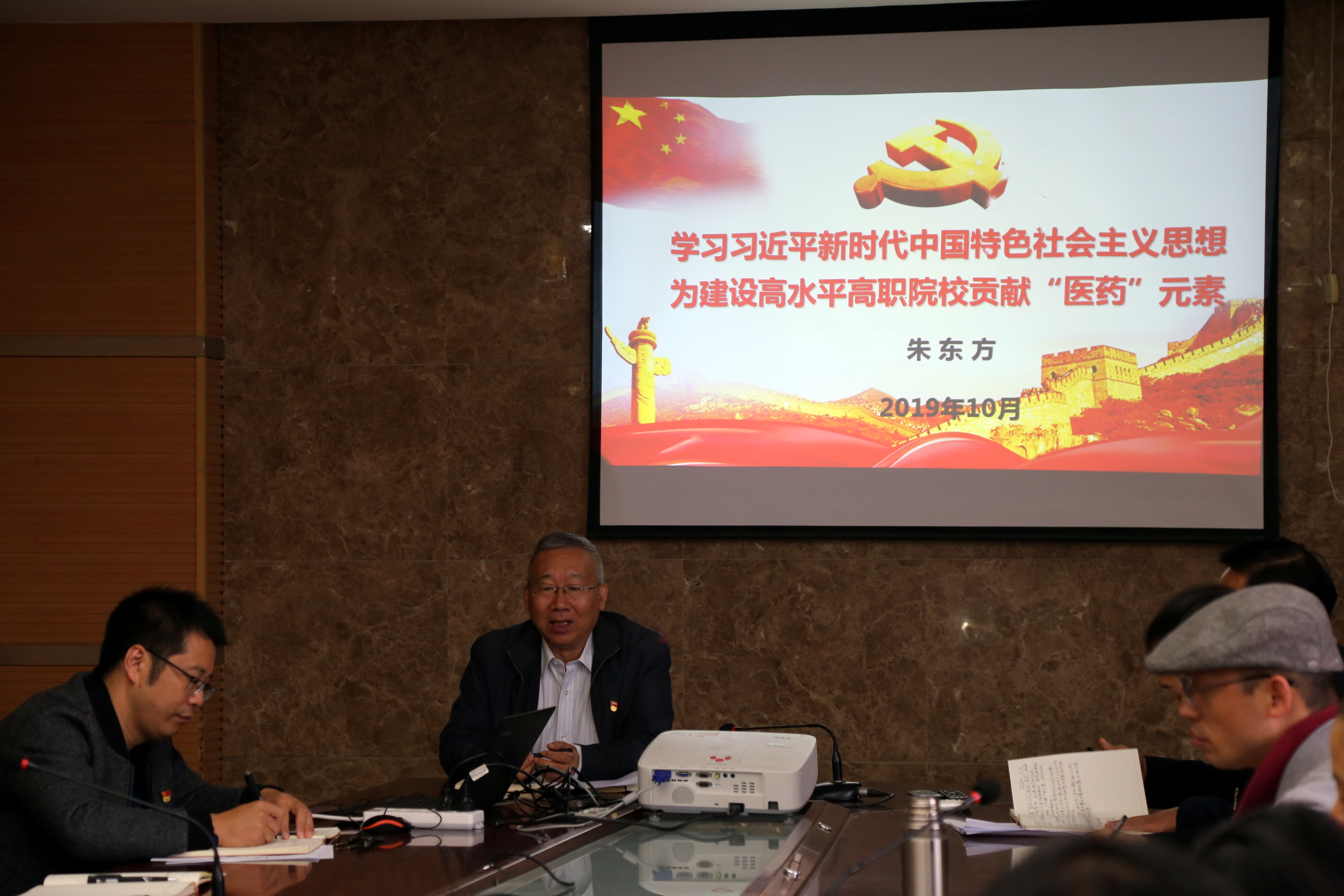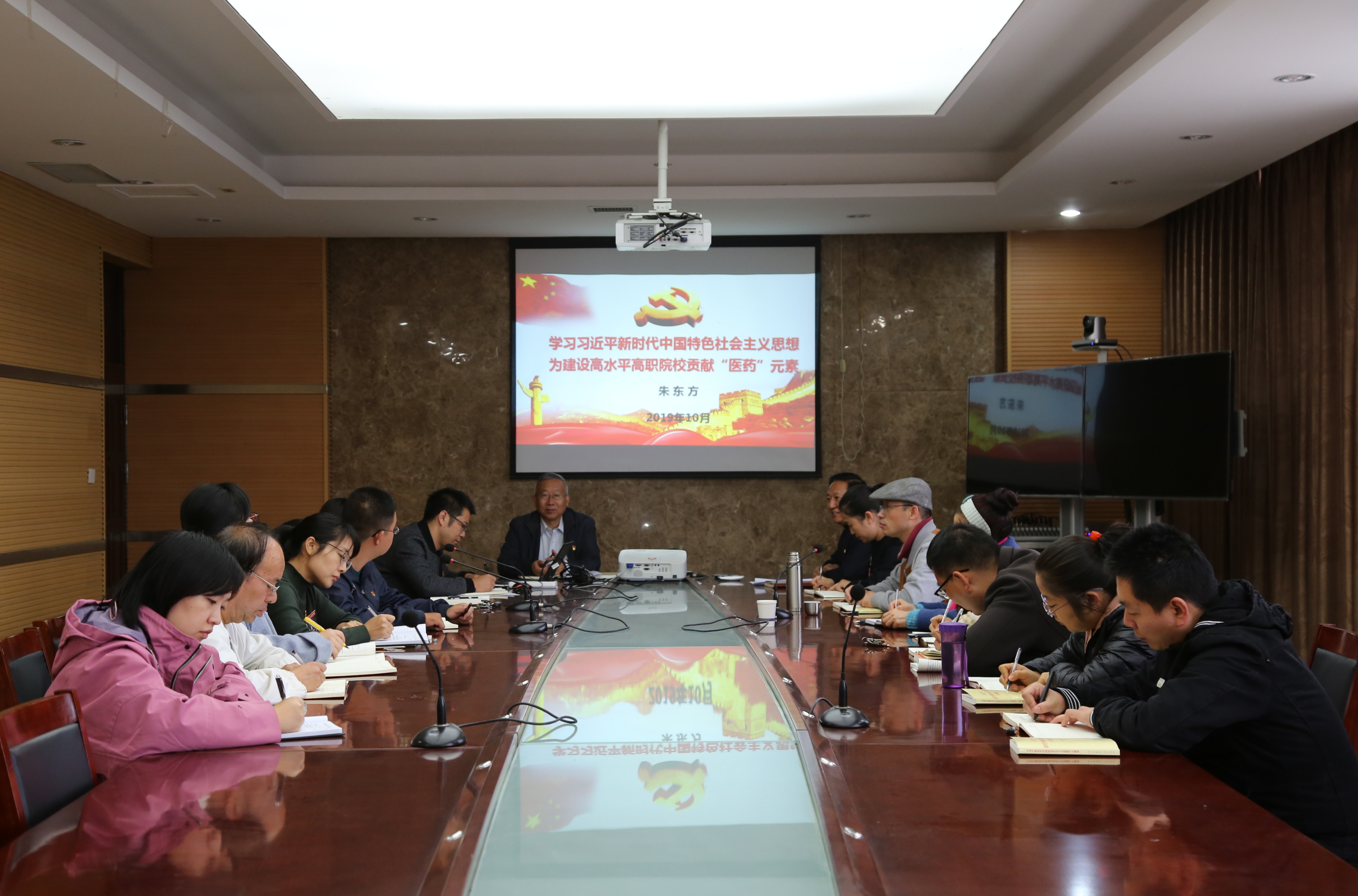 2019年10月16日下午,校党委副书记朱东方同志以“学习习近平新时代中国特色社会主义思想,为建设高水平高职院校贡献‘医药'元素”为题,在四楼第一会议室为医药学院全体党员上了一堂“不忘初心、牢记使命”主题教育专题党课,会议由医药党总支书记韩宝来同志主持。