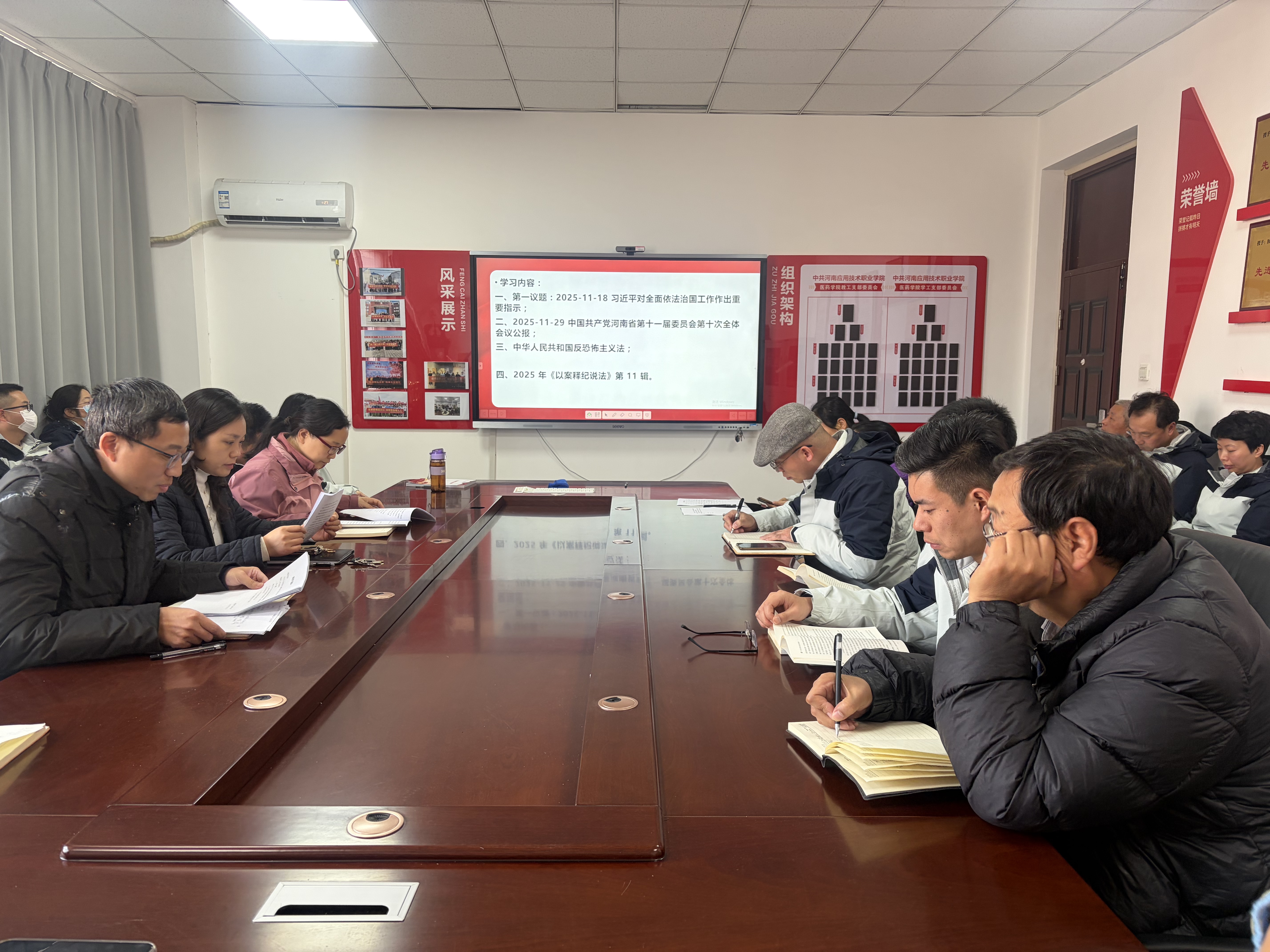 会上,郑言带领全体教师深入学习第一议题:“习近平对全面依法治国工作作出重要指示”;yl6809永利集团党总支副书记、院长李元元领学“中国共产党河南省第十一届委员会第十次全体会议公报”;yl6809永利集团副院长唐贝领学“中华人民共和国反恐怖主义法”;随后,大家共同学习《以案释纪说法》第 11 辑。
