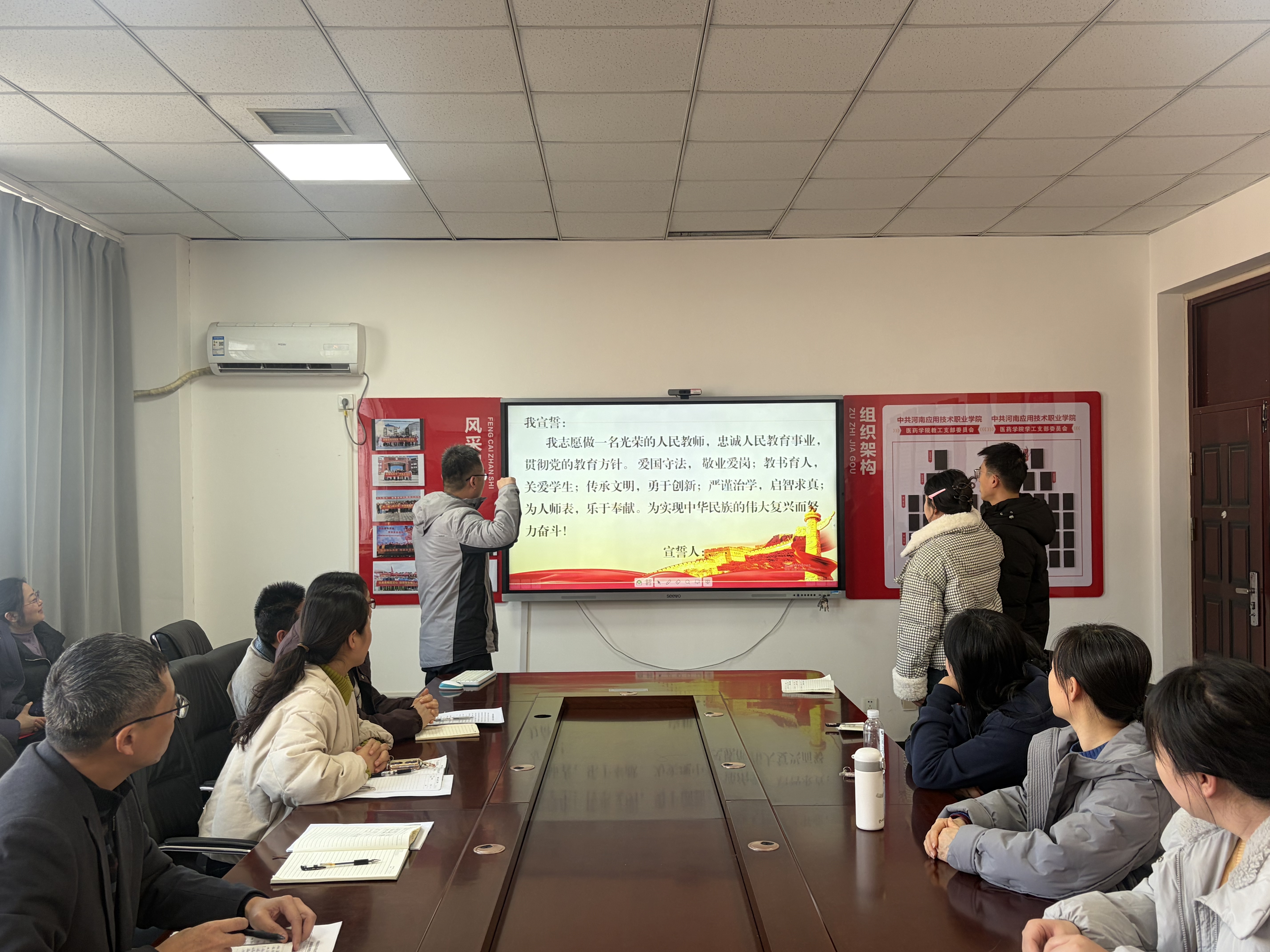 随后,党总支书记张亮带领学院新进教师开展廉洁从教宣誓活动,引导青年教师扣好职业生涯廉洁从教的“第一粒扣子”,筑牢拒腐防变的思想防线。宣誓现场,新进教师举拳立誓,誓言铿锵有力,彰显了廉洁从教、潜心育人的坚定决心。