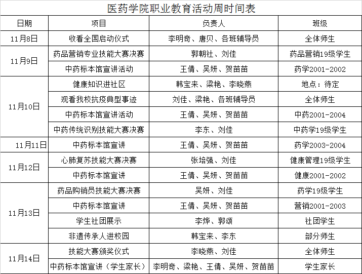 按照学校要求,结合我院专业特色,从宣传党和国家职业教育方针政策、宣传我校职业教育改革发展重要成果、宣传我院职业教育典型案例等方面,医药学院拟开展以下活动: