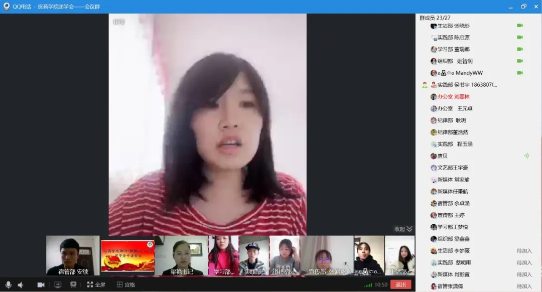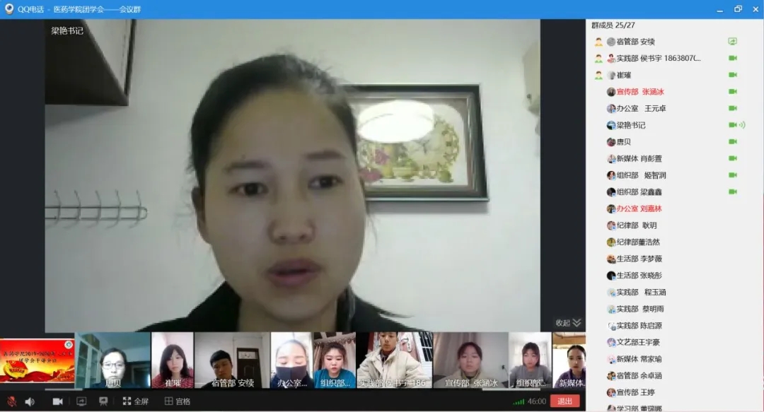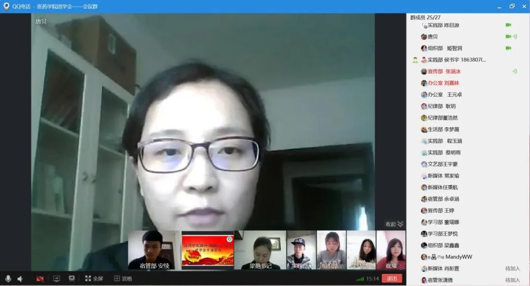 最后,崔璀老师对团学会干部提出几点要求,要求团学会成员应充分发挥学生干部的骨干作用,在督促班级同学按时填报返校前居家观察健康数据;开学时间听候学校通知,没有学校明确通知,任何学生不得提前返校,停课不停学,放假不放松,鼓励学生充分利用网络资源,进行自主学习;在青年大学习以及校园文化和主题团日活动上要提高政治站位,强化服务意识,狠抓工作落实,凝聚青年之力,为学校打赢疫情防控阻击战贡献青春力量。