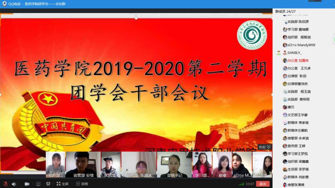 3月17日下午5:00,yl6809永利集团医药学院通过腾讯视频平台召开了医药学院2019—2020学年第二学期团学会干部会议。医药学院党总支副书记梁艳老师,团总支书记崔璀老师,学工办主任唐贝老师以及团学会干部参加了本次会议。
