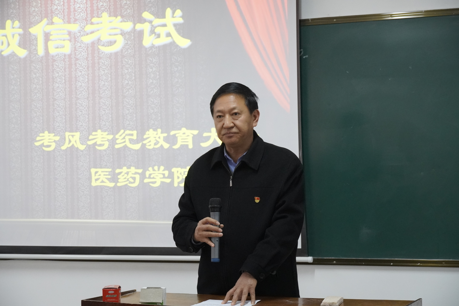 首先是医药学院党总支书记韩宝来讲话,他指出诚信是中华民族几千年流传下来的传统美德,诚信应是我们每个人都需恪守的原则。不要因为一时糊涂,而做出违背诚信的事情,不要因为一时考试作弊,而给自己留下终身的遗憾,从而因小失大。