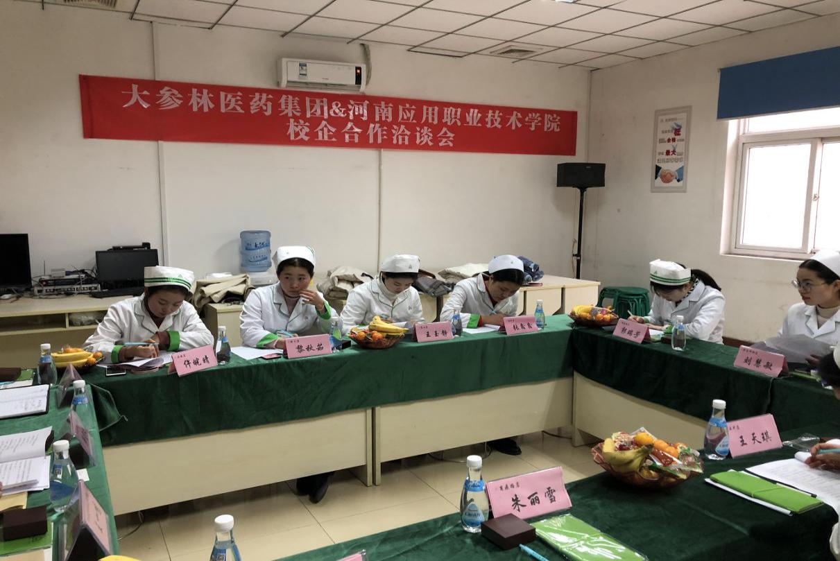 接着,在二楼会议室,韩院长、田主任一行与大参林公司人力资源部负责人董杰等人进行座谈。双方就建立校外实习实训基地、设立“大参林”奖学金、公司为学校投资建设国内先进的智慧模拟药房等问题进行了交流并达成初步意向。
