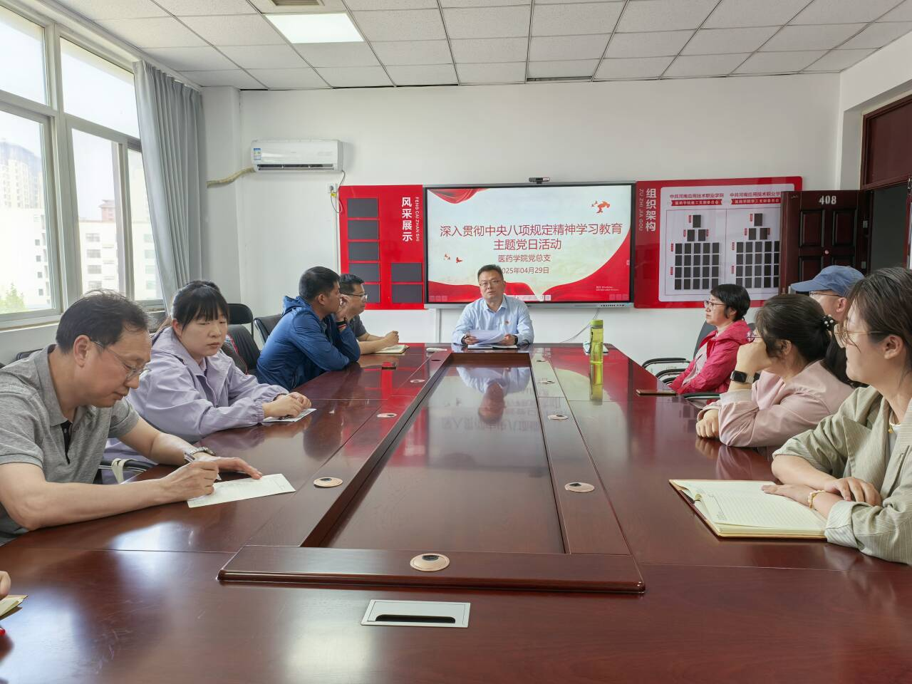 为深入贯彻落实中央八项规定精神,增强医药学院党员的纪律意识和规矩意识,4月29日,医药学院党总支组织党员教师开展深入贯彻中央八项规定精神学习教育主题党日活动,以加强学习切实增强思想自觉和行动自觉,将贯彻中央八项规定精神与学院各项工作紧密结合起来,以优良的作风推动学院工作的高质量发展。