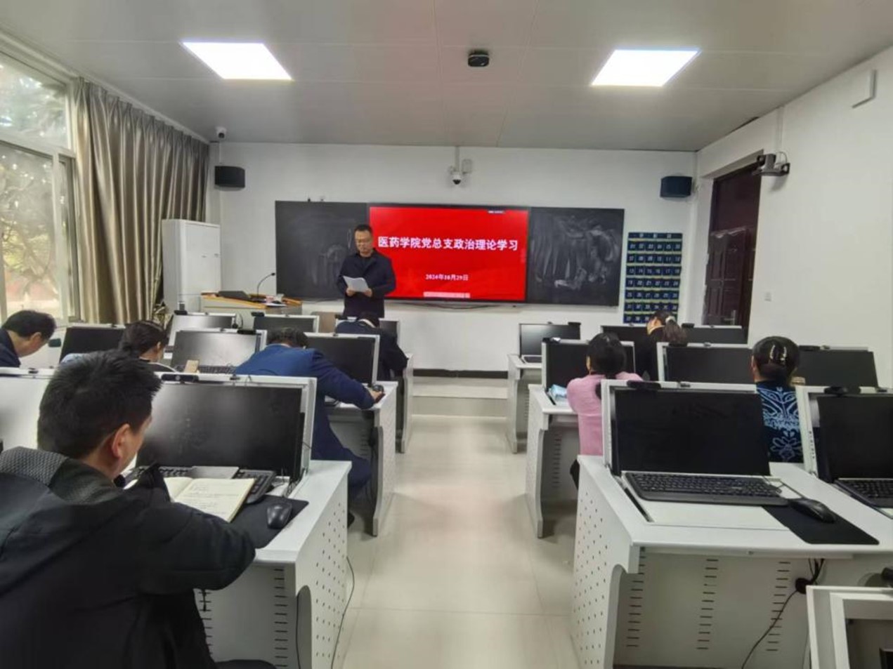 2024年10月29日下午,医药学院党总支在办公楼122开展政治理论学习。本次学习由学院党总支书记张亮主持,学院全体教职工参加。