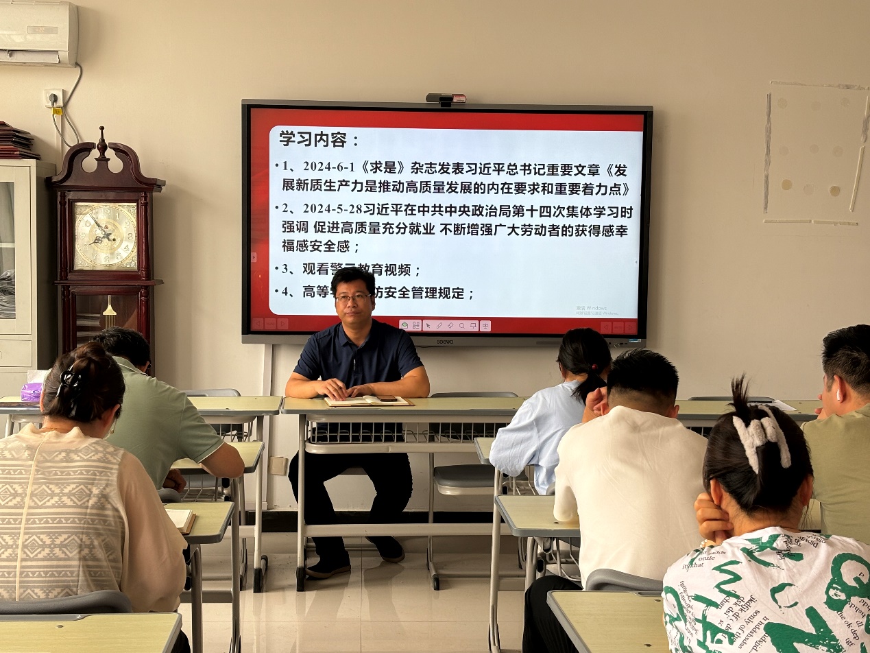 会上,大家共同学习了:《求是》杂志发表习近平总书记重要文章《发展新质生产力是推动高质量发展的内在要求和重要着力点》;习近平在中共中央政治局第十四次集体学习时强调促进高质量充分就业 不断增强广大劳动者的获得感幸福感安全感;高等学校消防安全管理规定;共产党员网党纪学习教育专题:《中国共产党纪律处分条例》解读一。