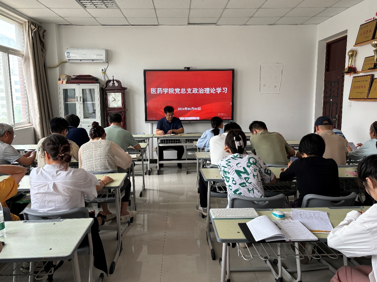 6月4日下午,医药学院党总支在办公楼408党员活动室开展政治理论学习。本次学习由学院党总支副书记肖东伟主持,医药学院全体教职工参加。