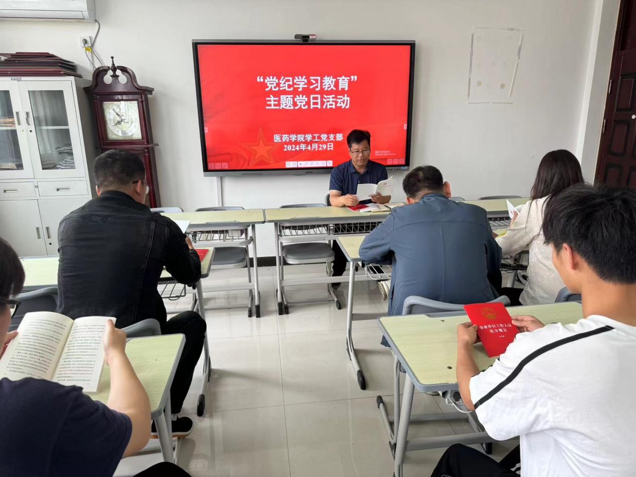 按照中央和省委、省委教育工委、省教育厅党组和我校党委关于开展党纪学习教育的部署要求,医药学院党总支结合总支实际制定了党纪学习教育计划,4月29日下午,医药学院学工党支部按计划开展了“党纪学习教育”主题党日活动,支部全体党员参加了学习活动。