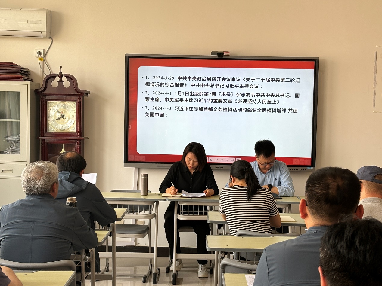 会上,大家共同学习了:中共中央政治局召开会议审议《关于二十届中央第二轮巡视情况的综合报告》中共中央总书记习近平主持会议;4月1日出版的第7期《求是》杂志发表中共中央总书记、国家主席、中央军委主席习近平的重要文章《必须坚持人民至上》;习近平在参加首都义务植树活动时强调全民植树增绿共建美丽中国。