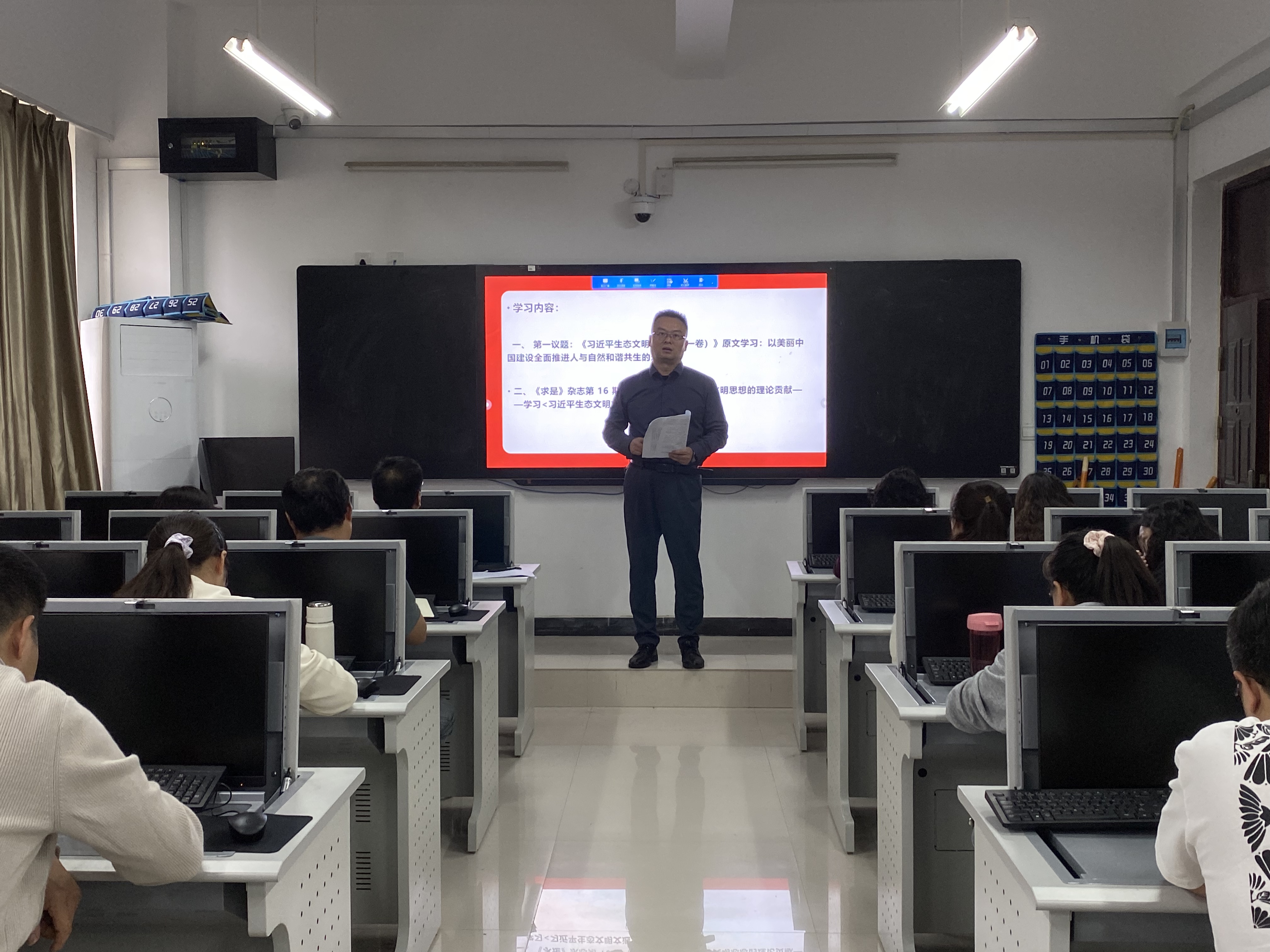 会上,张亮带领全体教师深入学习第一议题:《习近平生态文明文选(第一卷)》原文学习:以美丽中国建设全面推进人与自然和谐共生的现代化。大家共同学习《求是》杂志第16期《深刻领会习近平生态文明思想的理论贡献——学习<习近平生态文明文选>第一卷》。