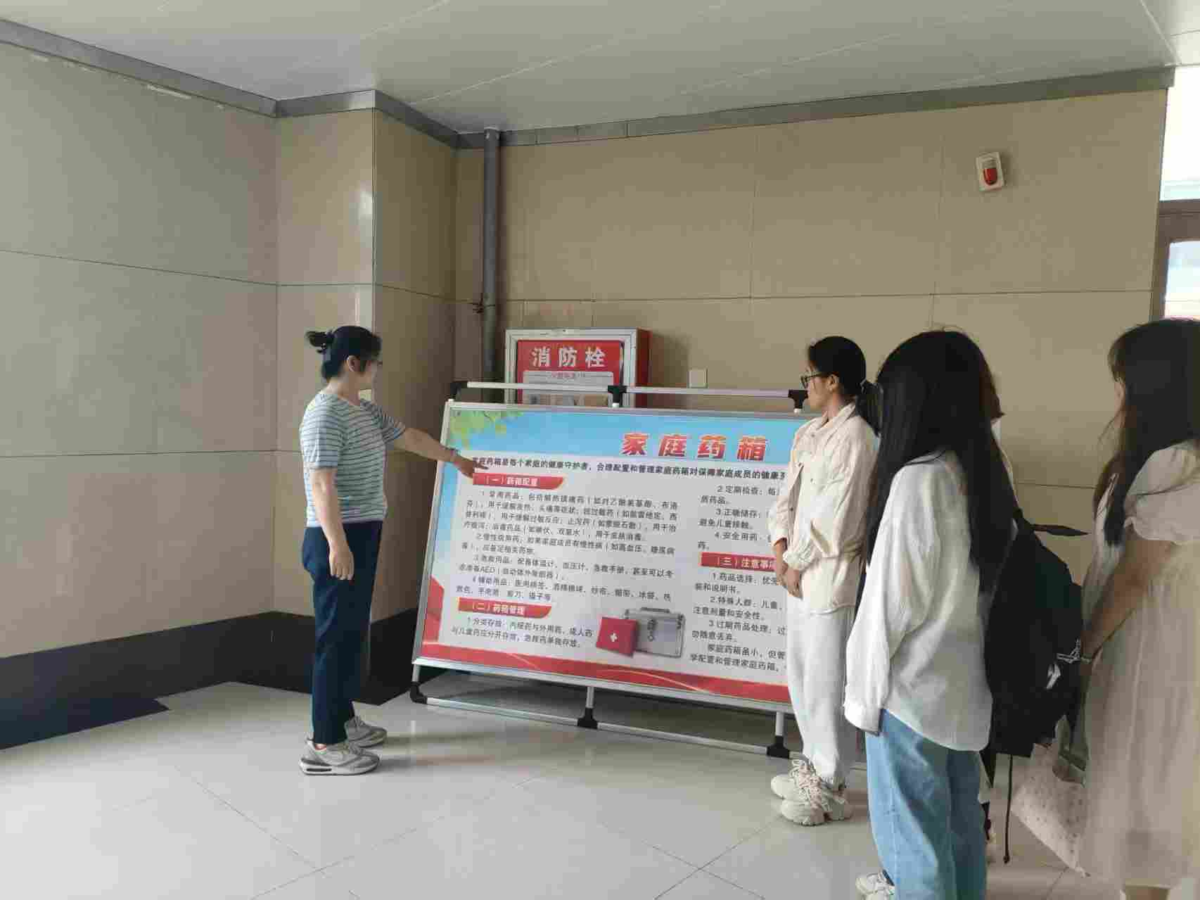 此次活动精心设计的展板内容丰富、形式新颖。展板围绕“家庭药箱如何配、怎么管、注意啥”三大核心问题展开。在家庭药箱配备药品板块,展板详细列举了常见疾病的应对药物,帮助学生清晰掌握家庭常用药知识。管理板块则着重强调了分类收纳的重要性,注意事项板块通过生动案例,提醒学生警惕药物混用风险、儿童误触隐患等,增强安全用药意识。活动现场,医药学院资深教师王老师站在精心设计的展板前,用生动形象的语言拉开了讲解的序幕。