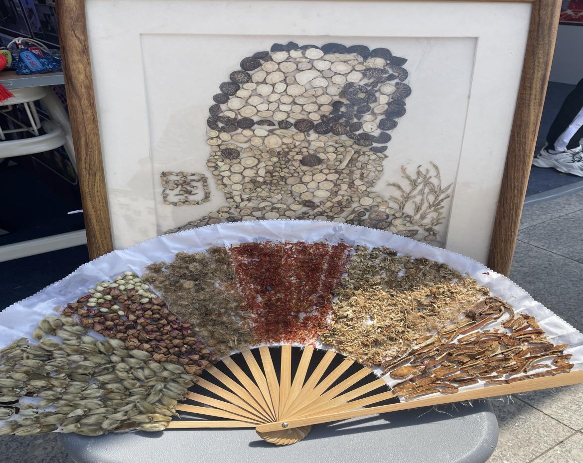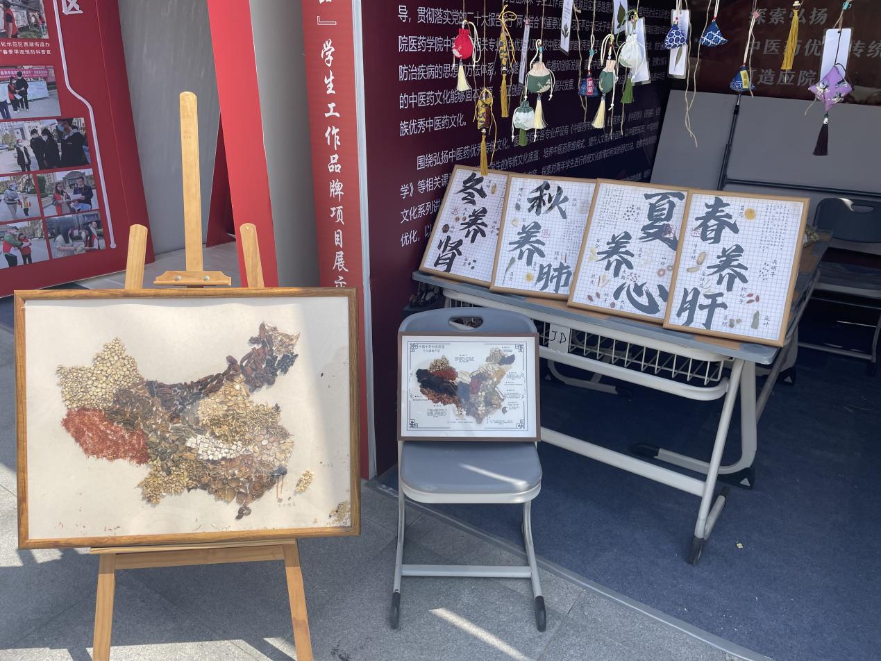 职业教育周期间医药学院还进行“创意国粹,描绘中药”作品展。同学们集思广益,精心设计,把中药材当“画笔”和“颜料”,巧妙运用枸杞、红花、陈皮、川芎、菊花、山楂、桔梗、防风等30余种中药本身天然的颜色和各异的形态,采用粘贴、拼剪、镶嵌等技艺,将中医药文化知识以有形的艺术表现,粘贴出“中国地图”、“李时珍”等作品,实现“古典与创新、药与美”的结合。