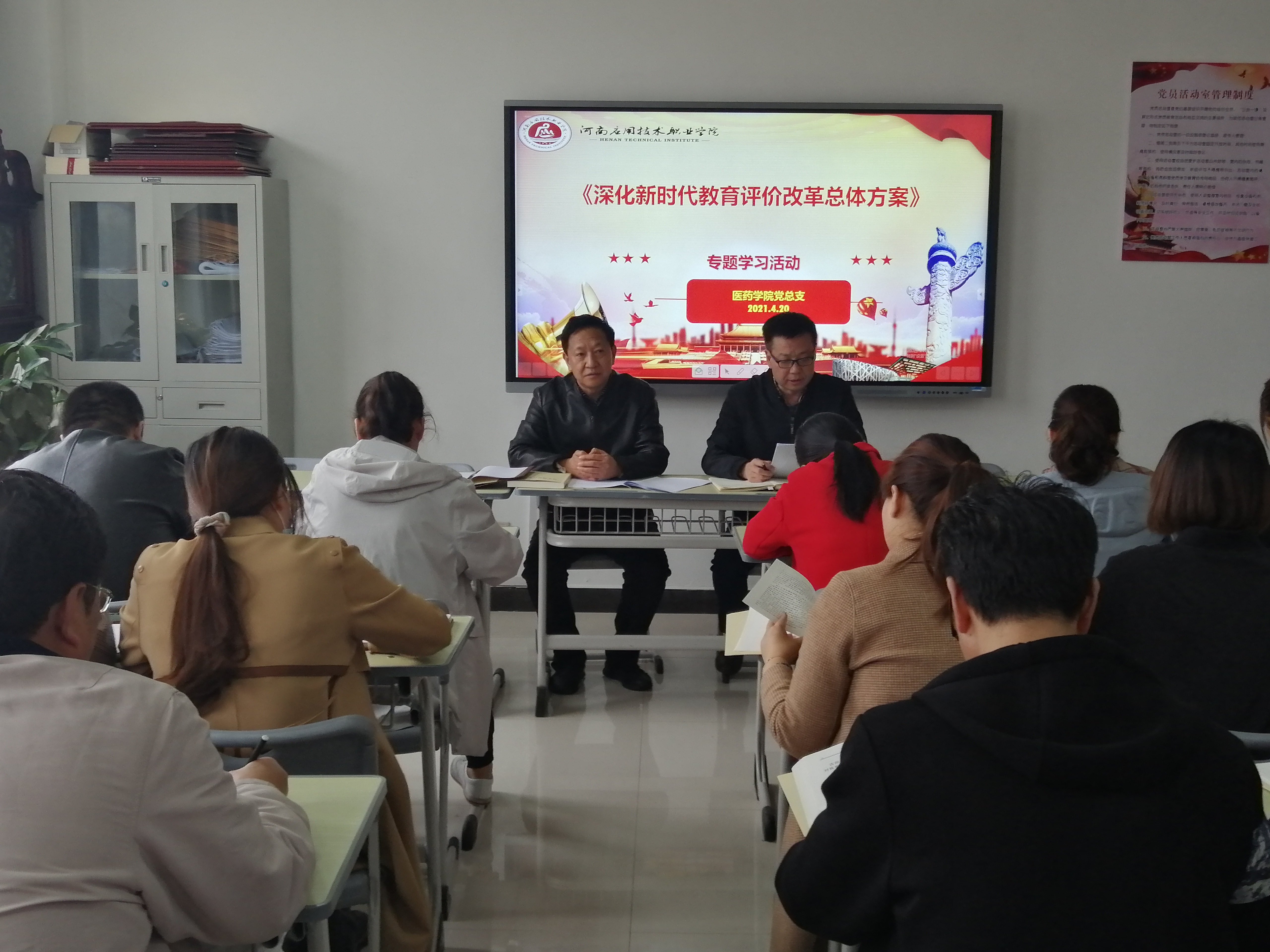 为深入贯彻落实习近平总书记关于教育的重要论述和全国教育大会精神,切实将中共中央、国务院《深化新时代教育评价改革总体方案》落到实处,按照省教育厅工作安排要求,结合学校实际,我校制定了《yl6809永利集团深化新时代教育评价改革实施方案》(以下称《实施方案》)。按照学校统一安排,4月20日下午,医药学院党总支组织全体教职工对《实施方案》进行了集中学习,党总支书记李明奇主持学习活动。