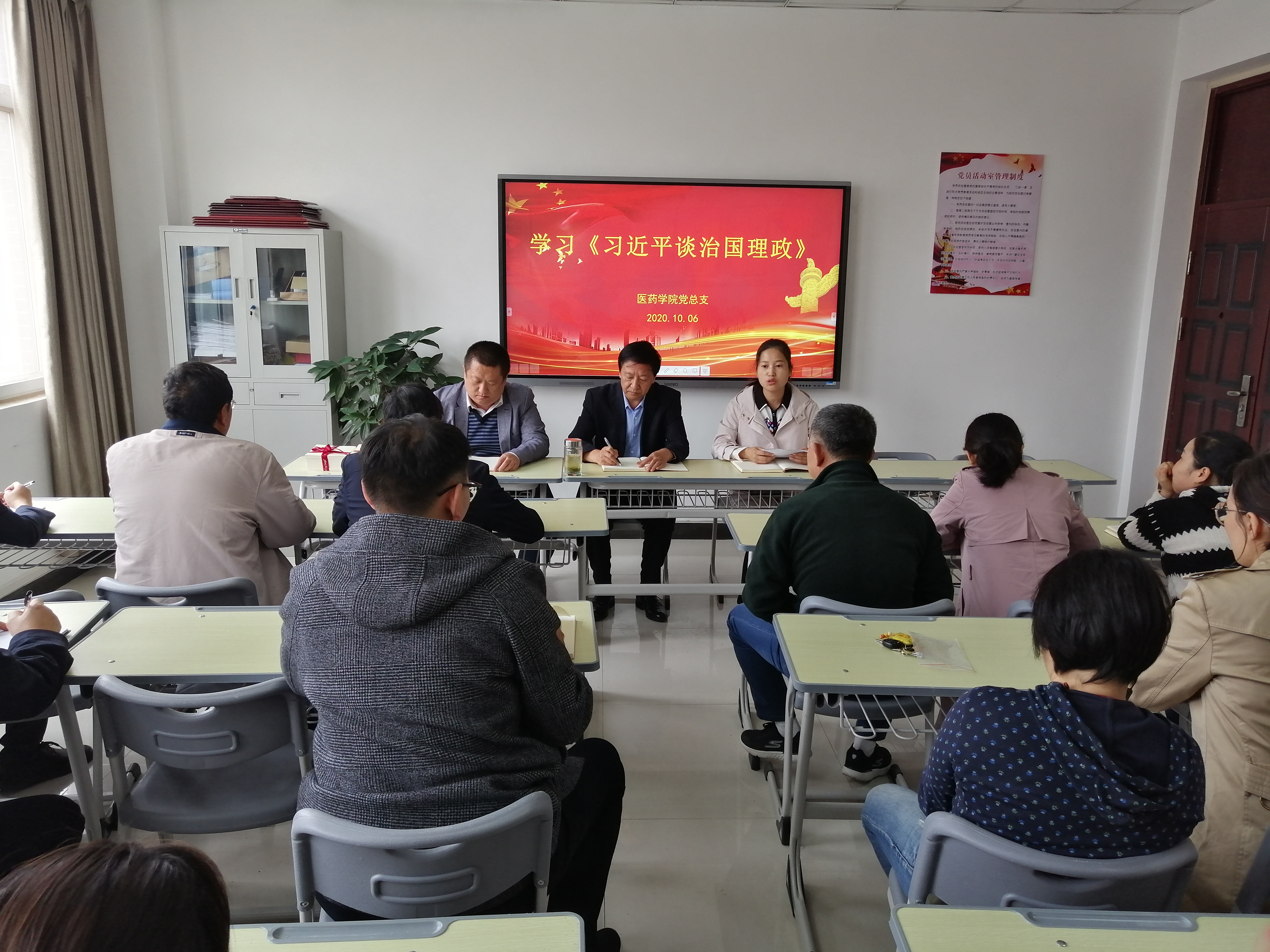 10月6日下午,按照学校统一要求,医药学院党总支在党员活动室组织全院教职工进行集中理论学习,学习内容为《习近平谈治国理政》第三卷选篇,梁艳副书记主持学习活动。
