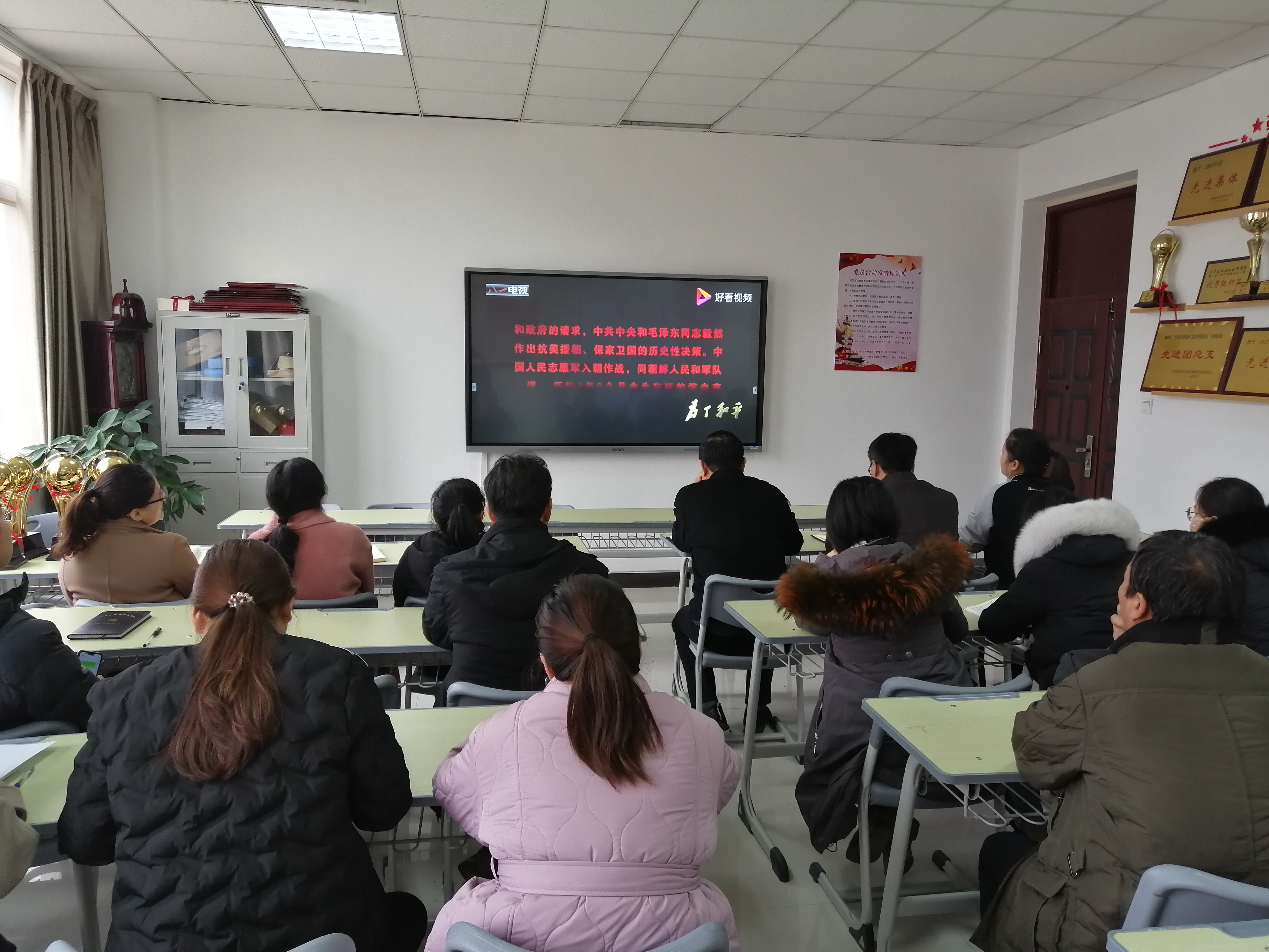 首先,全体人员集中观看了大型电视纪录片《为了和平》(第一集)——《正义担当》。《为了和平》是由中央军委政治工作部宣传局、国家广播电视总局宣传司、中央广播电视总台总编室出品,解放军新闻传播中心监制,解放军新闻传播中心广播电视部、中央广播电视总台军事节目中心联合摄制的大型电视纪录片。该片共6集,分别为《正义担当》《殊死较量》《血性迸发》《英雄赞歌》《万众一心》《伟大胜利》,每集约50分钟,采取史论结合、故事表达的方式,回顾呈现中国共产党领导抗美援朝战争的光辉历程和宝贵经验,全面反映抗美援朝战争的正义性质和伟大胜利,深入反映伟大的抗美援朝精神的丰富内涵和时代价值,集中展示中国人民志愿军的英雄事迹和革命精神,生动展现全国各族人民同仇敌忾、众志成城的大力支援和家国情怀,充分彰显中华民族不畏强暴、维护和平的坚定决心和巨大贡献。
