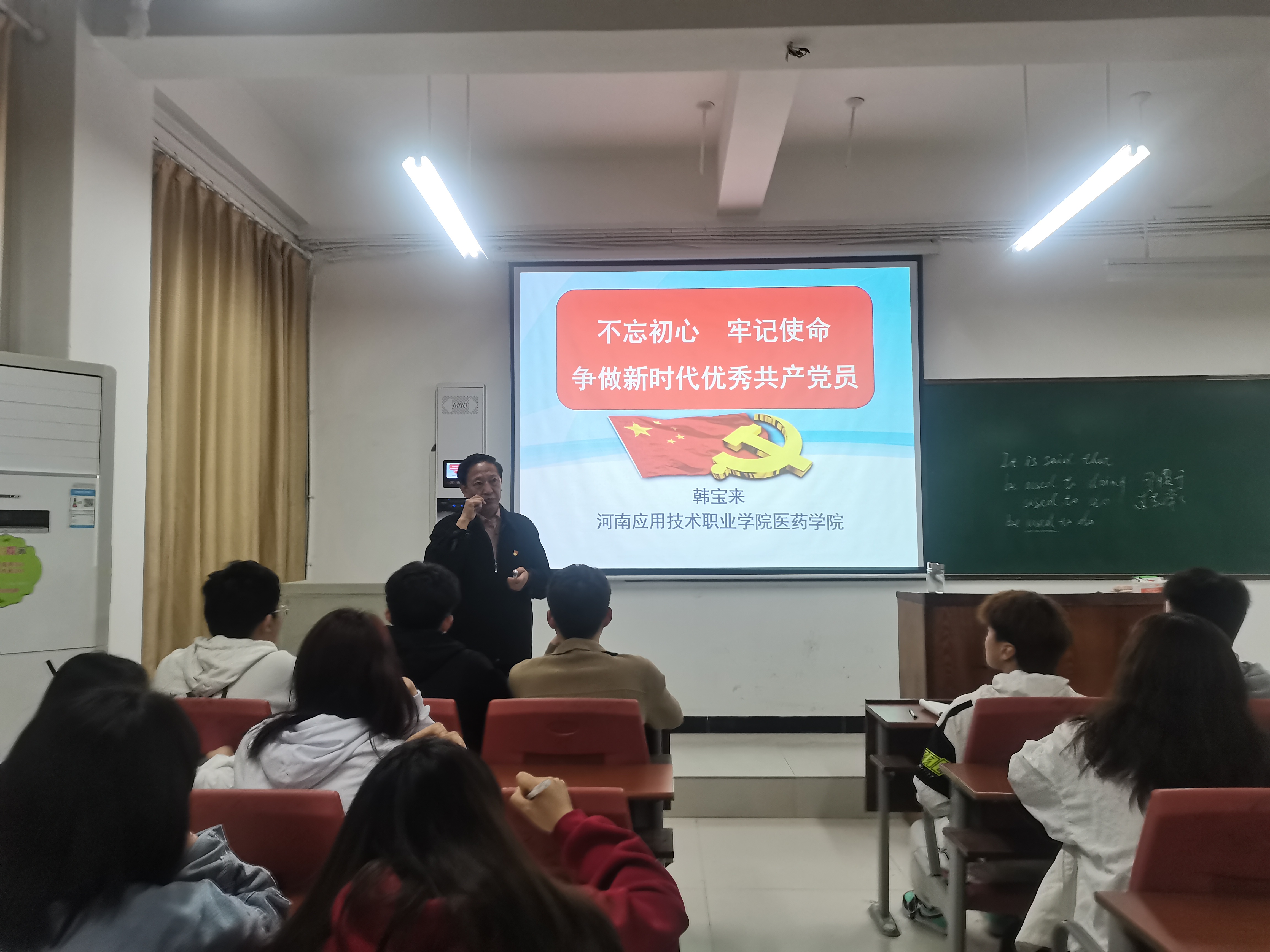 为了充分发挥思政铸魂育人的核心作用,全面贯彻落实全国高校思想政治工作会议精神,落实立德树人根本任务,全面打造“以文化人,以德育人”的校园氛围,3月28日晚上,医药学院院长韩宝来为医药学院入党积极分子上了一堂题为“不忘初心 牢记使命 争做新时代优秀共产党员”的党课,医药学院全体学生入党积极分子参加了学习。