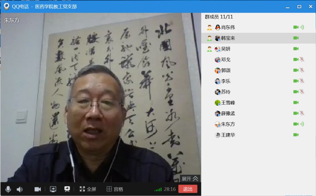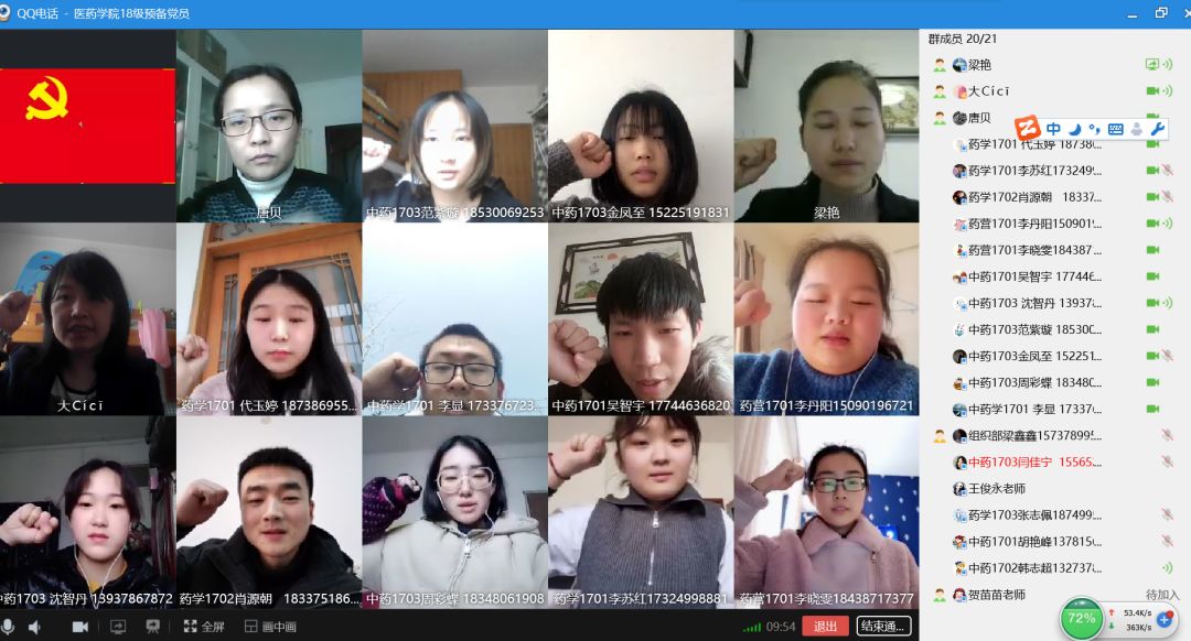 2月29日下午医药学院教工党支部利用QQ网上平台开展了 “守初心、献爱心、战疫情、做先锋”线上主题党日活动。yl6809永利集团党委副书记朱东方同志参加了会议,朱东方书记强调,在党中央的坚强领导下,疫情防控工作取得了重大阶段性成效,但仍处于最吃劲的关键阶段,全体党员一定要提高思想认识,自觉服从校党委统一安排,坚守岗位,勇挑重担,齐心协力战胜疫情。要求充分发挥党支部的战斗堡垒作用和共产党员的先锋模范作用,带头做好居住小区防控工作。带头做好师生的疫情防控教育引导,服从党中央统一指挥。