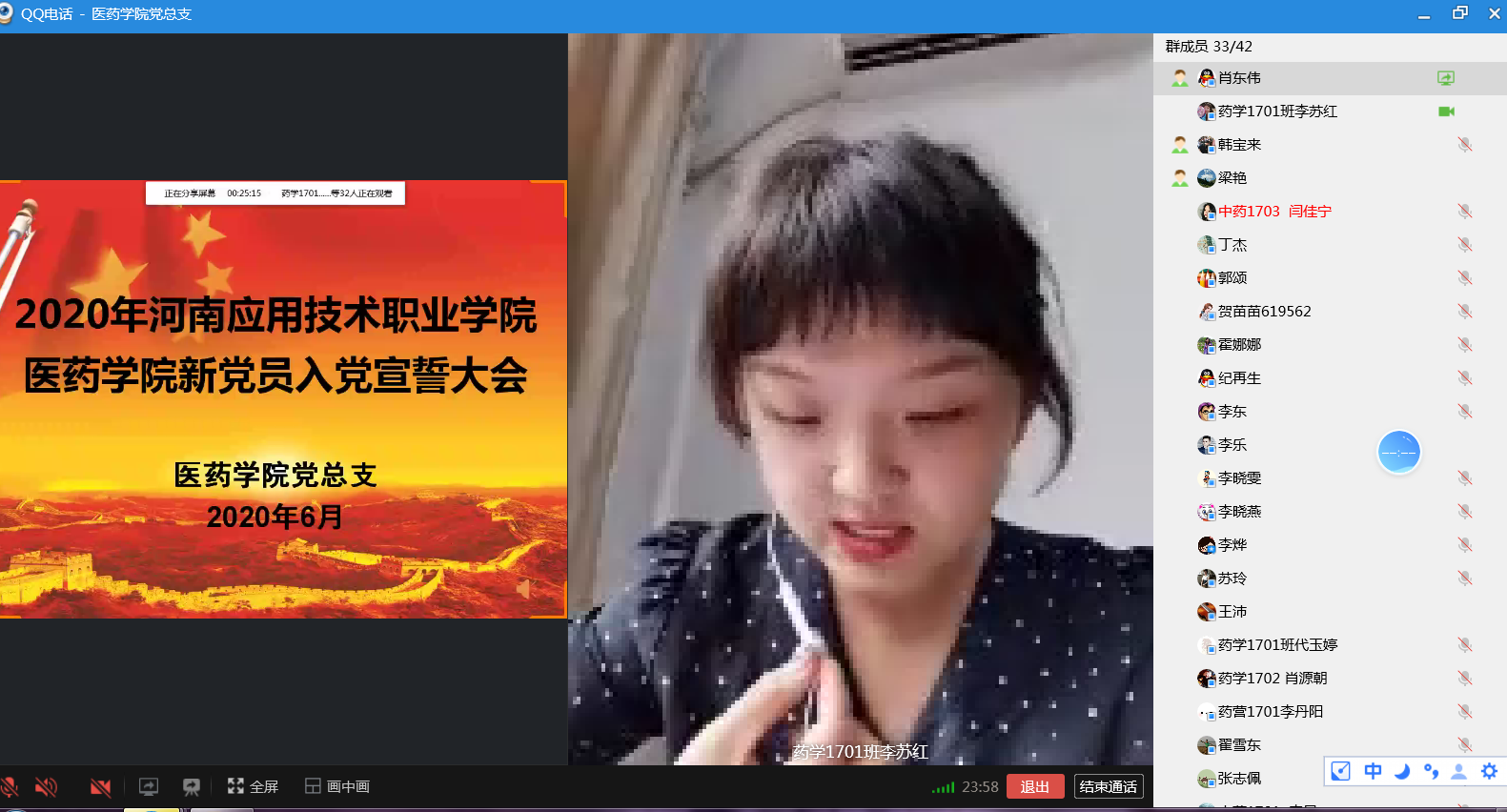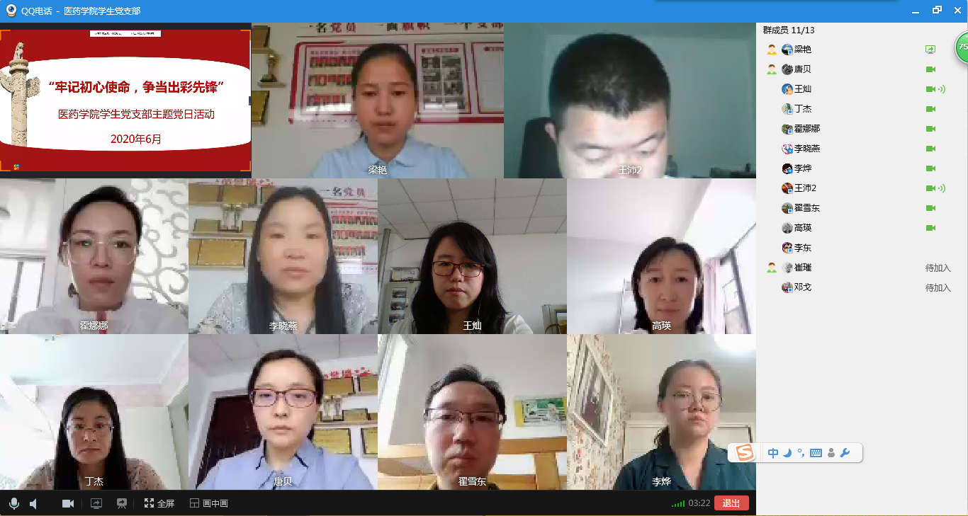 为庆祝建党99周年,按照省委组织部、省委高校工委和我校组织部有关要求,6月30日下午,医药学院党总支组织全体党员采取线上线下相结合的方式开展了“牢记初心使命,争当出彩先锋”主题党日活动。活动由医药学院党总支副书记梁艳主持,学校党委副书记朱东方、教工和学生支部支委委员在第一会议室线下参加,其他党员通过QQ线上平台参加。