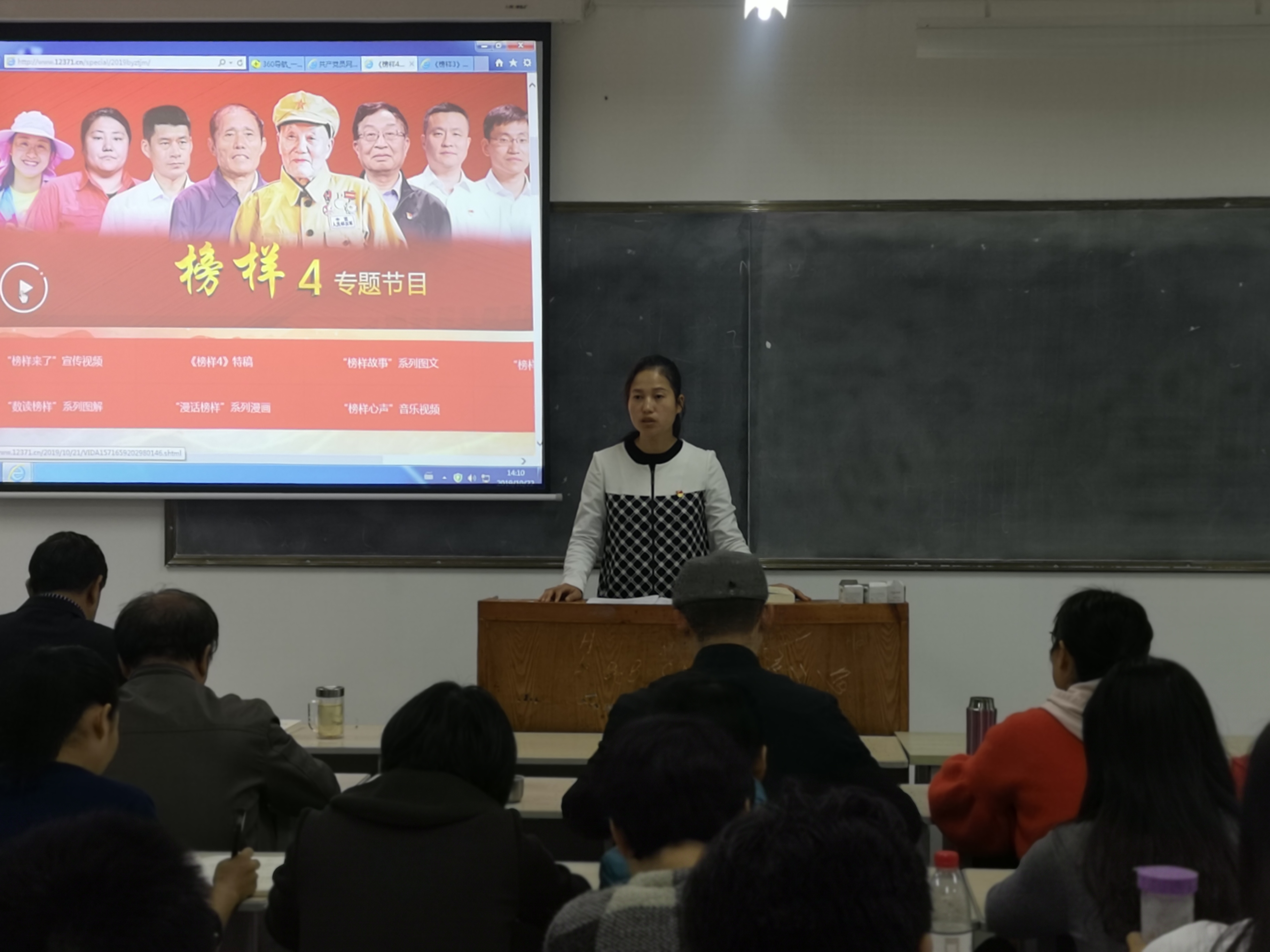 首先,全体教职工集体学习观看由中央组织部和中央广播电视总台联合录制的专题片《榜样4》,影片集中展示了张富清、李连成、黄文秀、唐真亚、李萌、隋耀达及“嫦娥”科研团队坚定信仰、担当作为、服务群众、无私奉献的精神风貌。接着,梁艳书记带领大家学习“不忘初心 牢记使命”主体教育学习内容第五部分“勇于担当作为”:1.“新时代要有新气象,要有新作为——《习近平关于“不忘初心、牢记使命”重要论述选编》,2.习近平总书记在庆祝改革开放40周年大会上的讲话——《习近平关于“不忘初心、牢记使命”重要论述选编》,3.《深入学习习近平关于教育的重要论述》序言、4.坚持优先发展教育事业、5.全面提升教育质量”等内容。