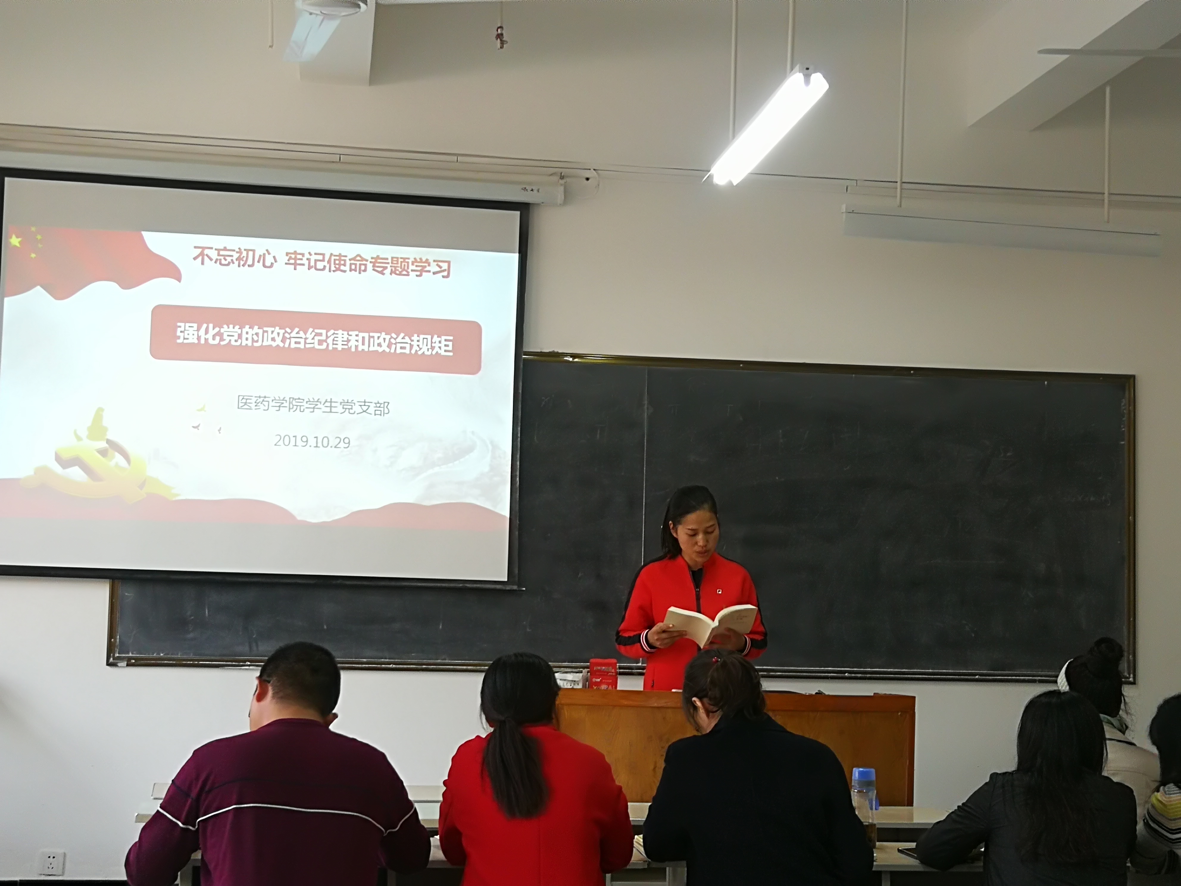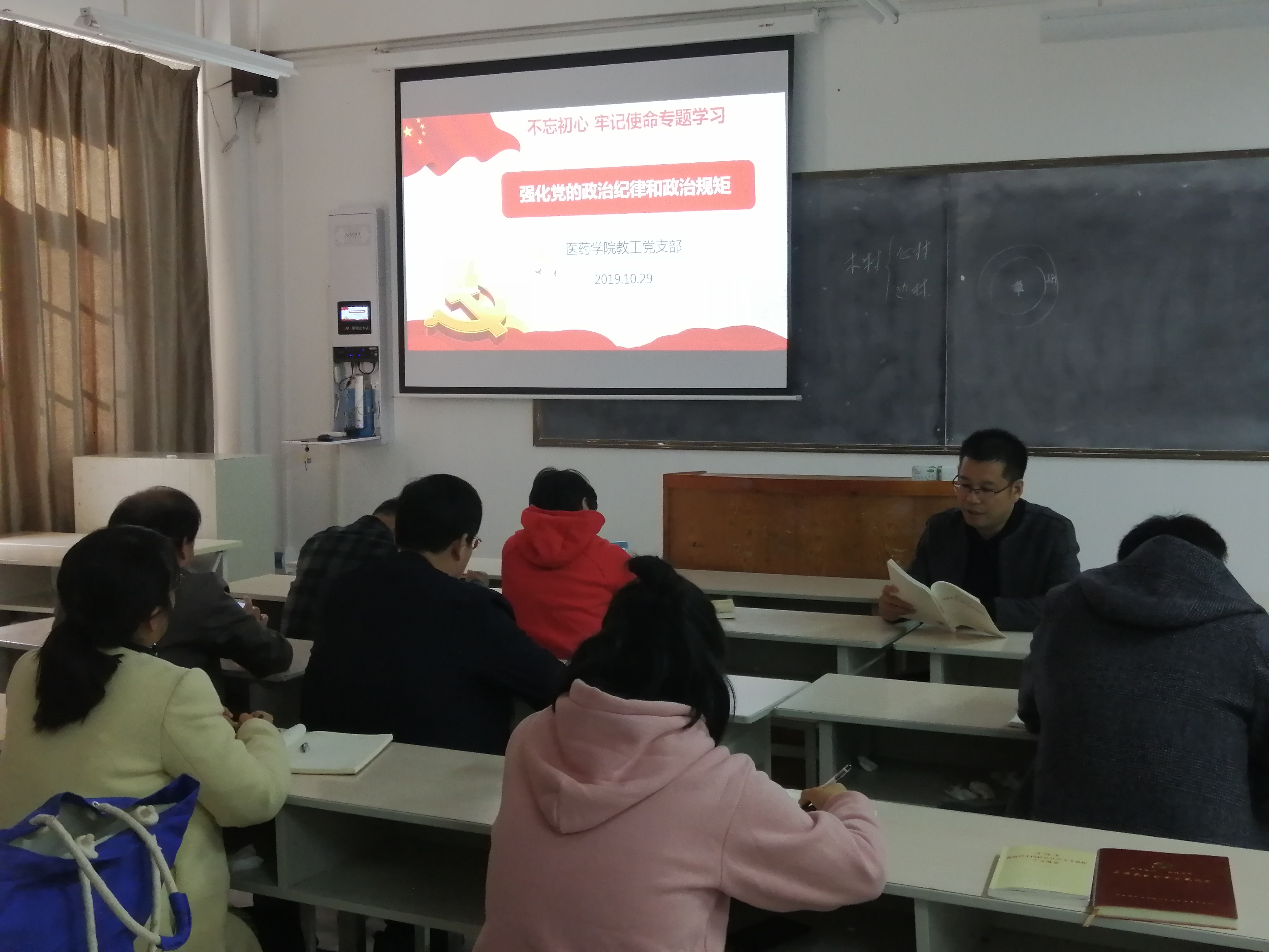 按照学校“不忘初心 牢记使命”主体教育学习安排,2019年10月29日下午,医药学院教工党支部、学生党支部组织全体党员分别在教学楼104和105教室进行集中学习。学生党支部由支部书记梁艳领学,教工党支部由宣传委员肖东伟领学。