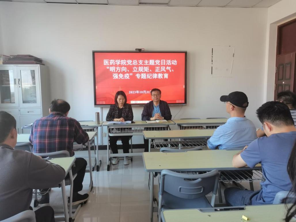 为深入贯彻落实党的二十大精神和习近平总书记关于严明党的纪律和规矩的重要论述,全面加强党的纪律建设, 10月31日下午,医药学院党总支开展了“明方向、立规矩、正风气、强免疫”专题纪律教育主题党日活动,本次活动由党总支书记崔咏梅主持。