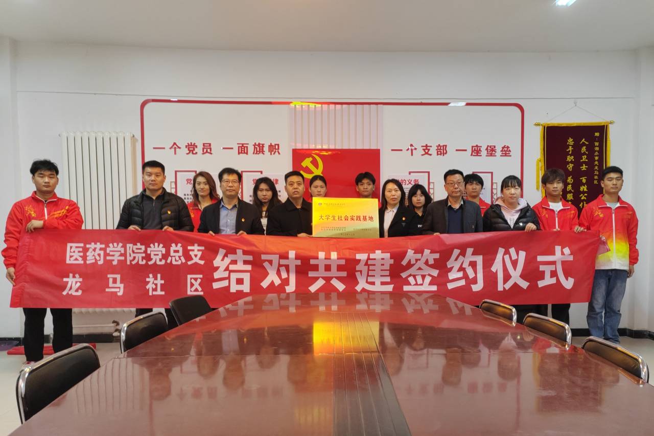 崔咏梅和陈小强分别介绍了医药学院党总支和龙马社区党支部的基本情况。崔咏梅表示“双报到”是巩固党员宗旨意识,树牢为民情怀,增进文明建设的重要途径,学院党总支将结合自身专业优势,以“双报到”活动为抓手,不断推进校社党建共建落实落细。陈小强对校社共建表示大力支持,他说龙马社区拥有良好的社会实践条件,可以为在校大学生提供实践锻炼的平台,并就下一步结对合作做出展望。座谈期间,双方举行了校社共建结对签约和“大学生社会实践基地”授牌仪式。