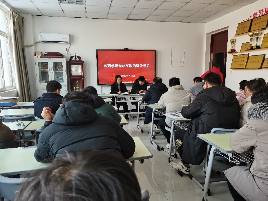 12月19日下午,医药学院党总支在办公楼408党员活动室开展政治理论学习。本次学习由学院党总支书记崔咏梅主持,院长李明奇及全体教职工参加。