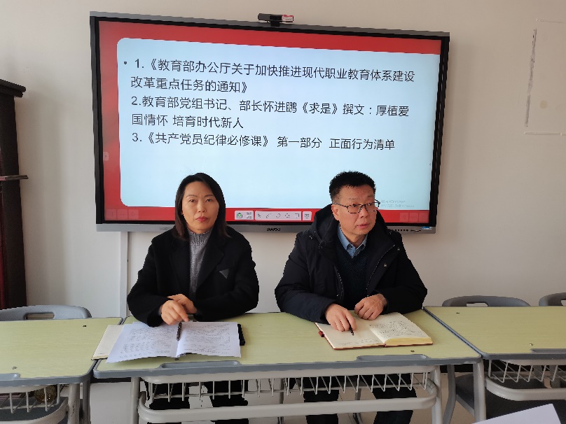 会上,大家共同学习了《教育部办公厅关于加快推进现代职业教育体系建设改革重点任务的通知》;教育部党组书记、部长怀进鹏《求是》撰文:厚植爱国情怀 培育时代新人;《共产党员纪律必修课》第一部分——正面行为清单等相关内容。