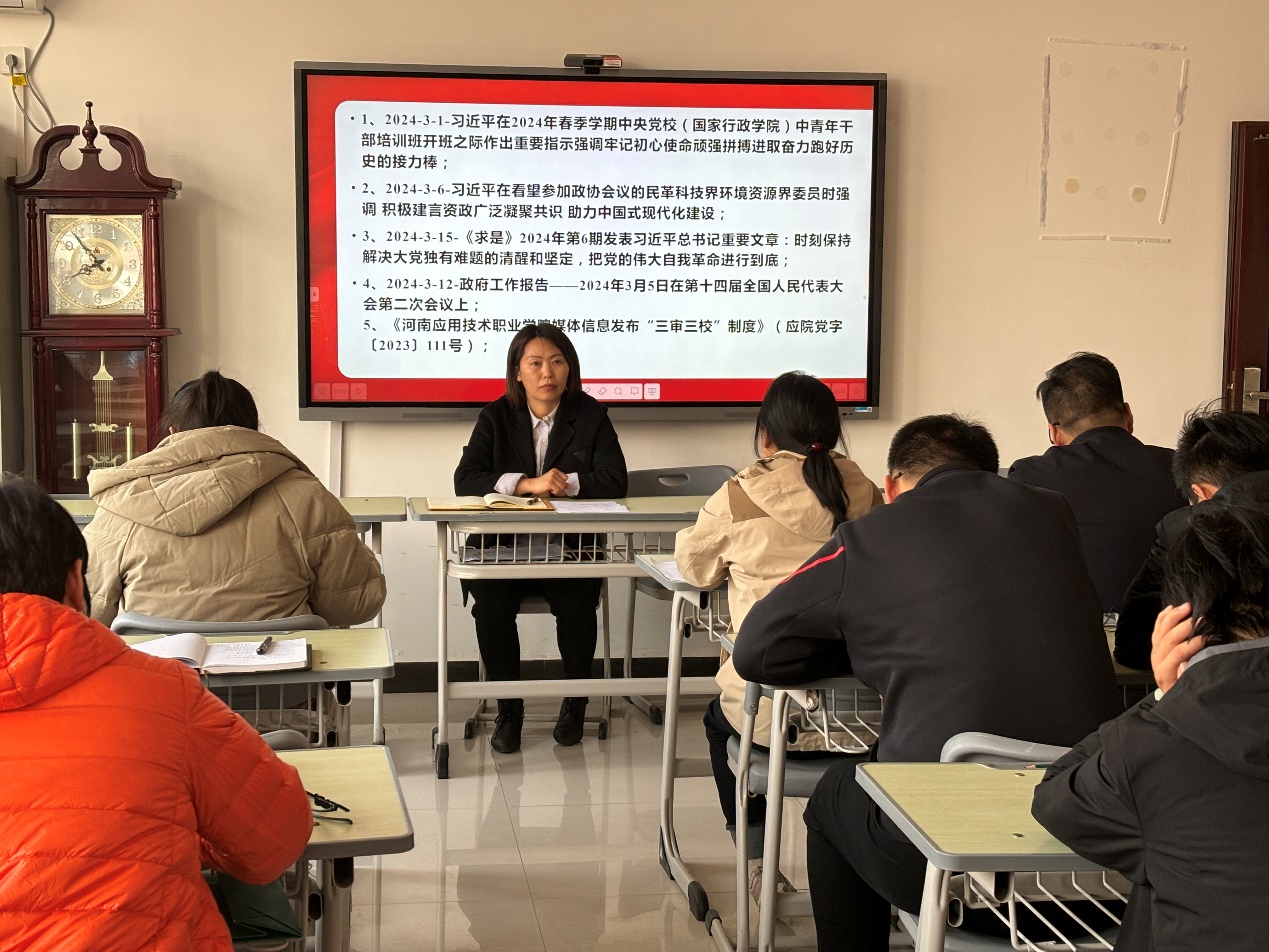 会上,大家共同学习了:习近平在2024年春季学期中央党校(国家行政学院)中青年干部培训班开班之际作出重要指示强调牢记初心使命拼搏进取奋力跑好历史的接力棒;习近平在看望参加政协会议的民革科技界环境资源界委员时强调积极建言资政广泛凝聚共识 助力中国式现代化建设;《求是》2024年第6期发表习近平总书记重要文章:时刻保持解决大党独有难题的清醒和坚定,把党的伟大自我革命进行到底;政府工作报告--2024年3月5日在第十四届全国人民代表大会第二次会议上;《yl6809永利集团媒体信息发布"三审三校"制度》(应院党字〔2023〕111号)。