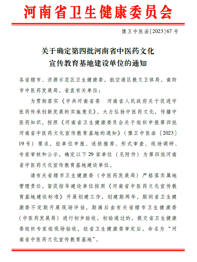 近日,河南省卫生健康委员会公布了第四批“河南省中医药文化宣传教育基地建设单位” ,我校中医药博物馆名列其中。这是继8月份获评“河南省社会科学普及基地”后再获省级殊荣。