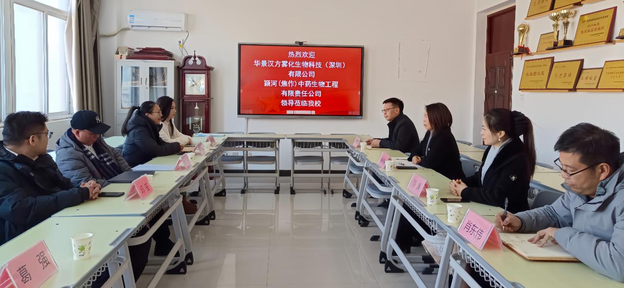 12月21日上午,景华汉方雾化生物科技有限公司总经理刘勇和颍河中药生物工程有限公司总经理胡依凡等领导等一行来到我校医药学院参观交流,科研外事处的游渊副处长、医药学院党总支书记崔咏梅、院长李明奇、副书记肖东伟等参加交流座谈。