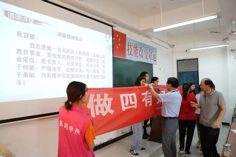 道德讲堂在“省自身”中拉开序幕。通过齐唱歌曲《奉献》、观看视频、齐诵《大学》段落等多种多样的方式,使在场师生从中药技能竞赛辅导教师团队的事迹中体会奉献的道德品质。在“谈感悟”环节,王新杰老师与纪再生老师结合自身实际和体会,谈了对听讲之后的感受和对敬业奉献的理解。最后在医药学院院长韩宝来老师带领下,广大教师再次重温河南教师誓词,并在“不忘初心,争做四有好老师”条幅上郑重签下自己的名字。
