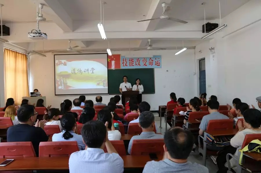 6月18日下午,由医药学院党总支承办的2019年第一期道德讲堂在教学楼102教室举办,来自医药学院与相关部门的100余名师生参加了活动。本期道德讲堂以“强师德 塑师风 铸师魂”为主题,共分为“省自身、唱歌曲、诵经典、学模范、谈感悟、行崇德礼、送吉祥七个环节进行。