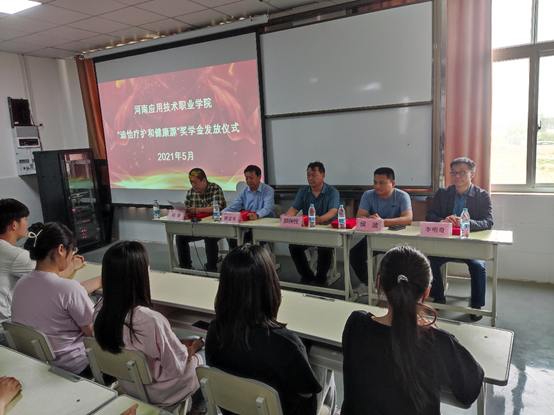 5月25日下午,我校“迪怡疗护和健康源”企业奖学金发放仪式在开封校区会议室举行,河南迪怡疗护科技开发有限公司董事长郭保栓、河南健康源生物科技有限公司董事长侯波、医药学院院长韩宝来、医药学院党总支书记李明奇出席会议。会议由医药学院副院长刘佳主持。