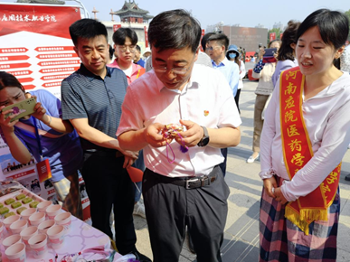 参展的职业院校通过展板、专业技能展示、现场参与互动等形式,展示学校专业特色和教学成果。在我校的展位上,医药学院带来了具有专业特色的中药香囊手工制作、中药药膳现场品尝、中医药传统文化知识普及等,充分展示了我校职业教育发展特色及成果,形式多样的特色中药创意产品吸引了开封市委常委、组织部部长刘汉征、副市长刘震等领导及新闻媒体的驻足,参观体验者络绎不绝、好评不断。刘部长表示,“我们要深入学习习近平总书记有关中医药传承与发扬的讲话精神,站在“文化自信”的高度,传承发展中医药,挖掘中医药这个伟大宝库。”