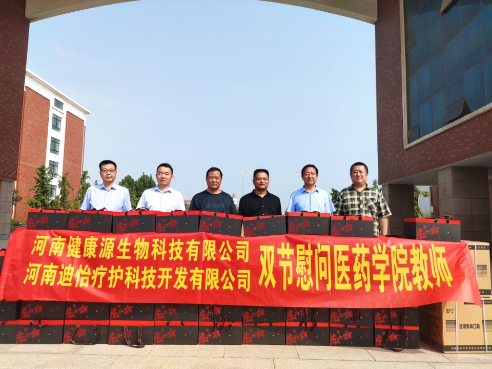 金秋九月,丹桂飘香,正值教师节和中秋节双节之际,河南健康源生物科技有限公司和河南迪怡疗护科技开发有限公司的侯波、郭宝栓、徐耀军总经理等一行5人,于9月16日上午来到医药学院,向辛勤耕耘一线的老师致以节日的祝福与诚挚的慰问,并为教师们送去了月饼等慰问品和口罩等防疫物资。