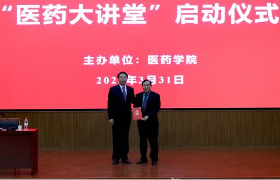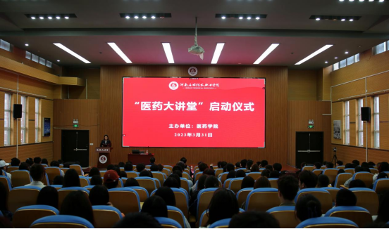 为全面提高医药专业学生职业素养、弘扬传承医药文化,3月31日,医药学院在开封校区南院五楼报告厅举办“医药大讲堂”启动仪式暨第一期讲座。我校党委书记闫俊山、郑州大学第二附属医院药学部焦红军主任、我校副校长刘振民、党委委员刘效平出席启动仪式,相关专业教师及学生近500人以线上线下相结合的方式参加了启动仪式和讲座。启动仪式由医药学院党总支书记崔咏梅主持。