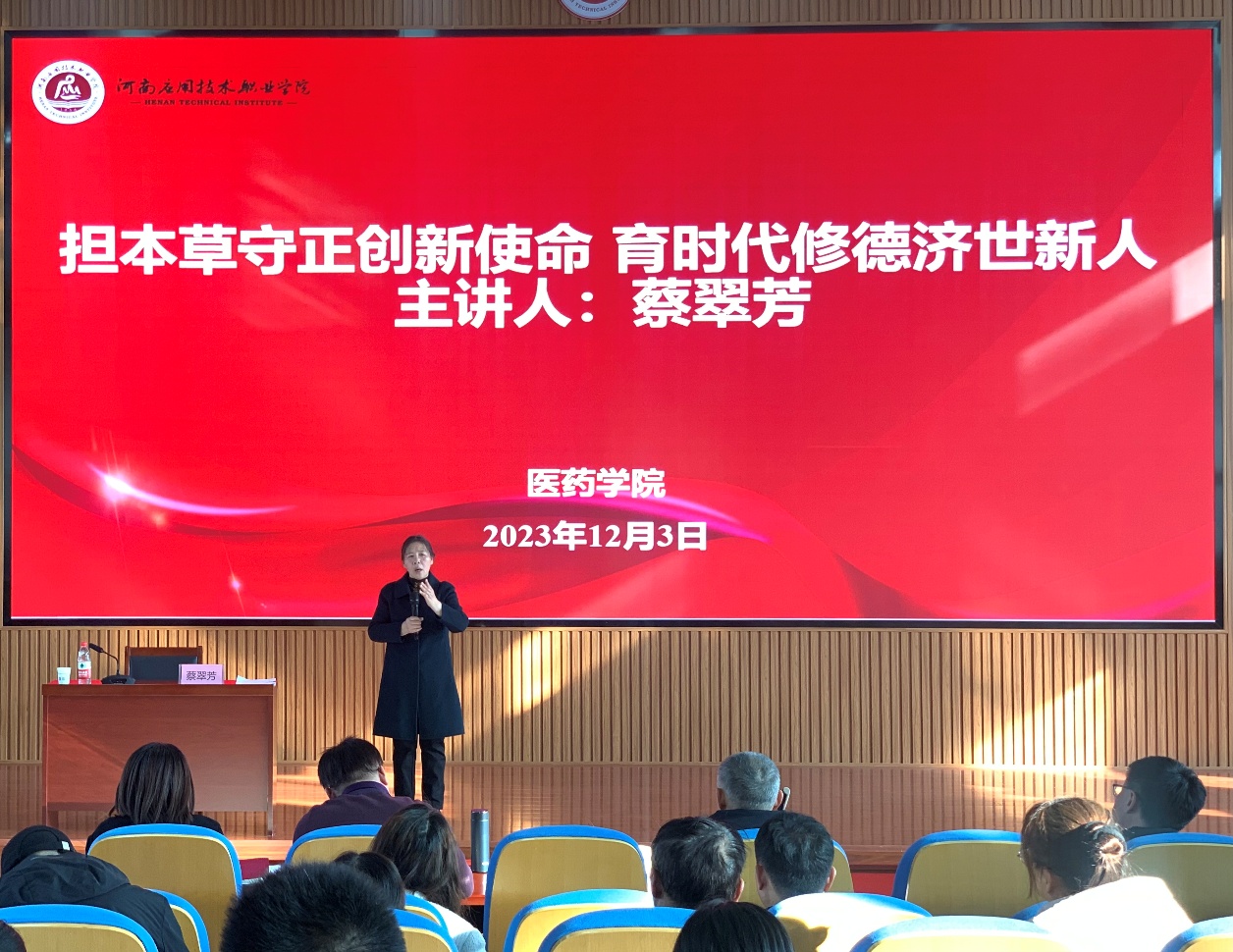 蔡翠芳以“担本草守正创新使命 育时代修德济世新人”为题进行了一场别开生面的讲座。她从个人成长发展和教学行政两方面入手,结合自己从事中药教育事业近40年的经历,从教育教学、科研服务、培养团队、专业建设等四个方面,讲述了自己为医药教育事业孜孜以求的感人故事。