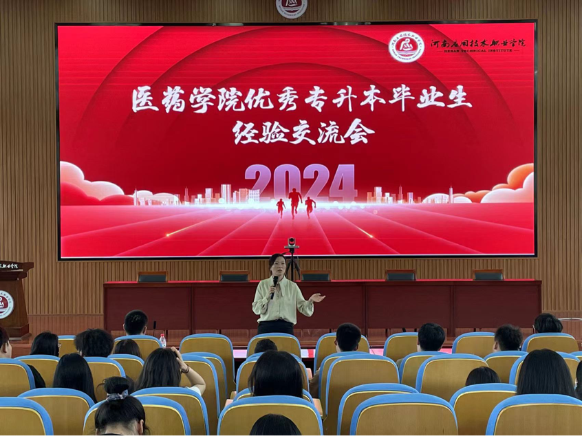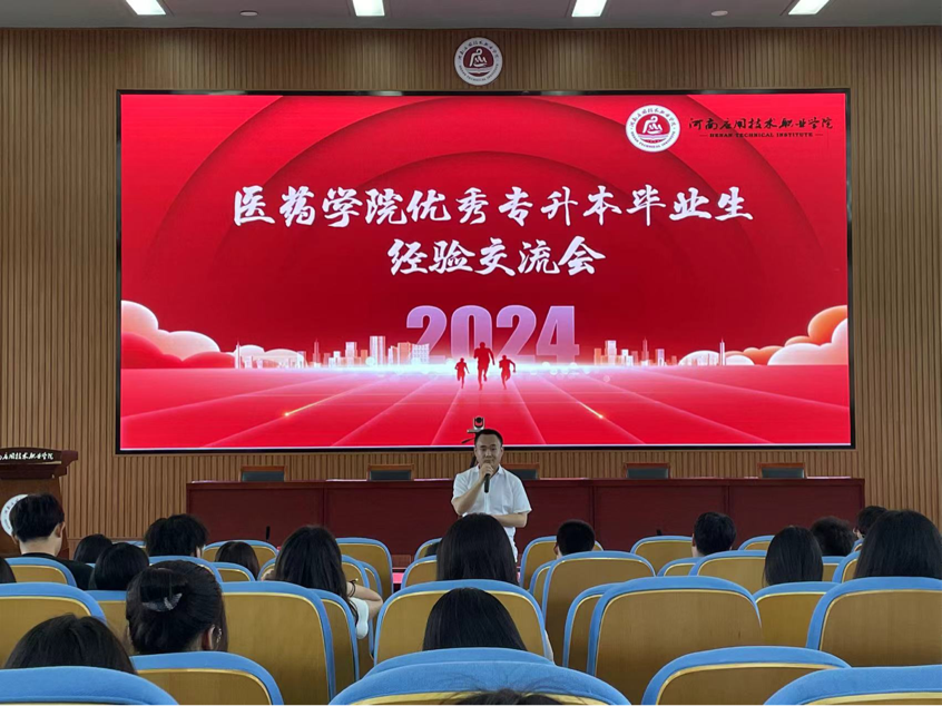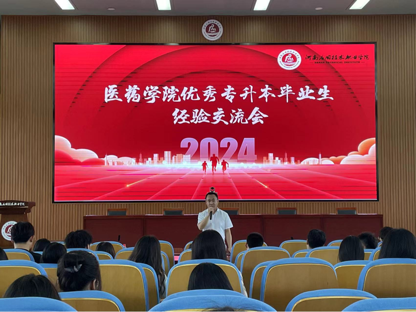 耕耘更知韶光贵,不待扬鞭自奔蹄。为进一步促进我院优良学风建设,营造良好的学习氛围,充分发挥朋辈示范引领作用,切实帮助同学们了解统招专升本考试考情,做好对未来的学习规划和掌握必要的备考技巧,5月9日,医药学院特邀我校2024年优秀专升本中药学专业“省状元”齐世茂,以及专升本成功的健康管理专业张博,为学弟学妹们做经验分享交流会。会议由杨漾老师主持。