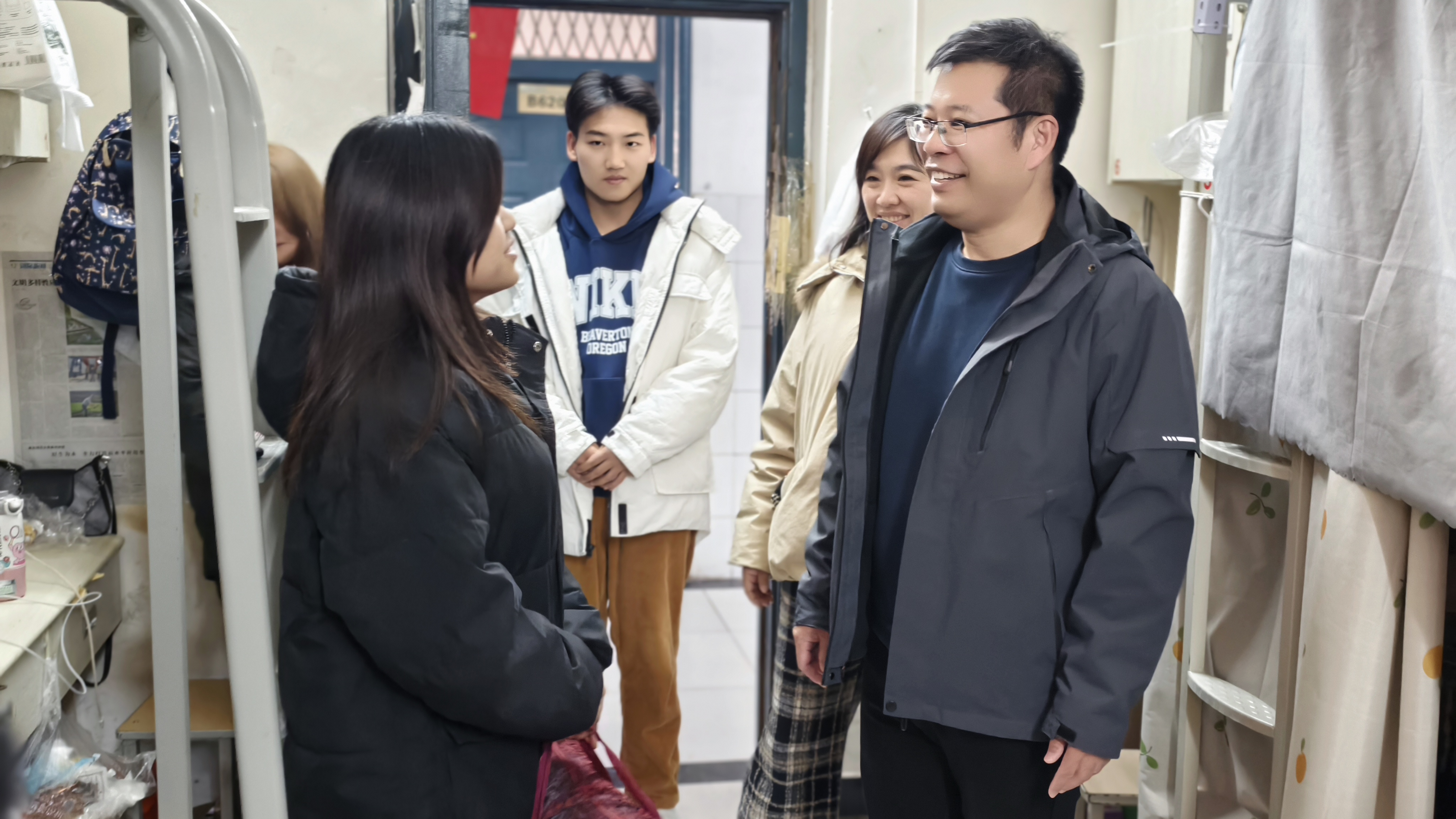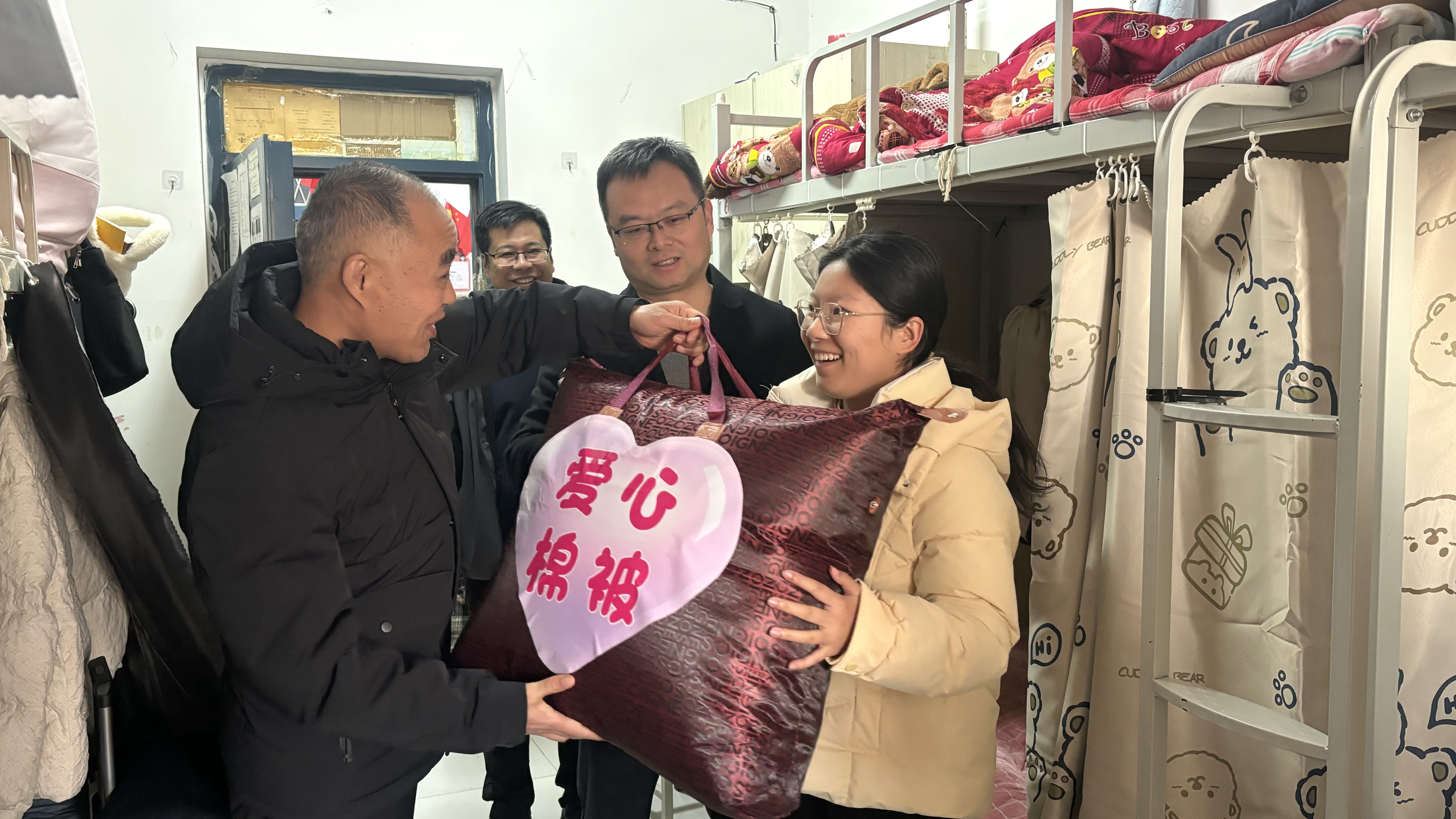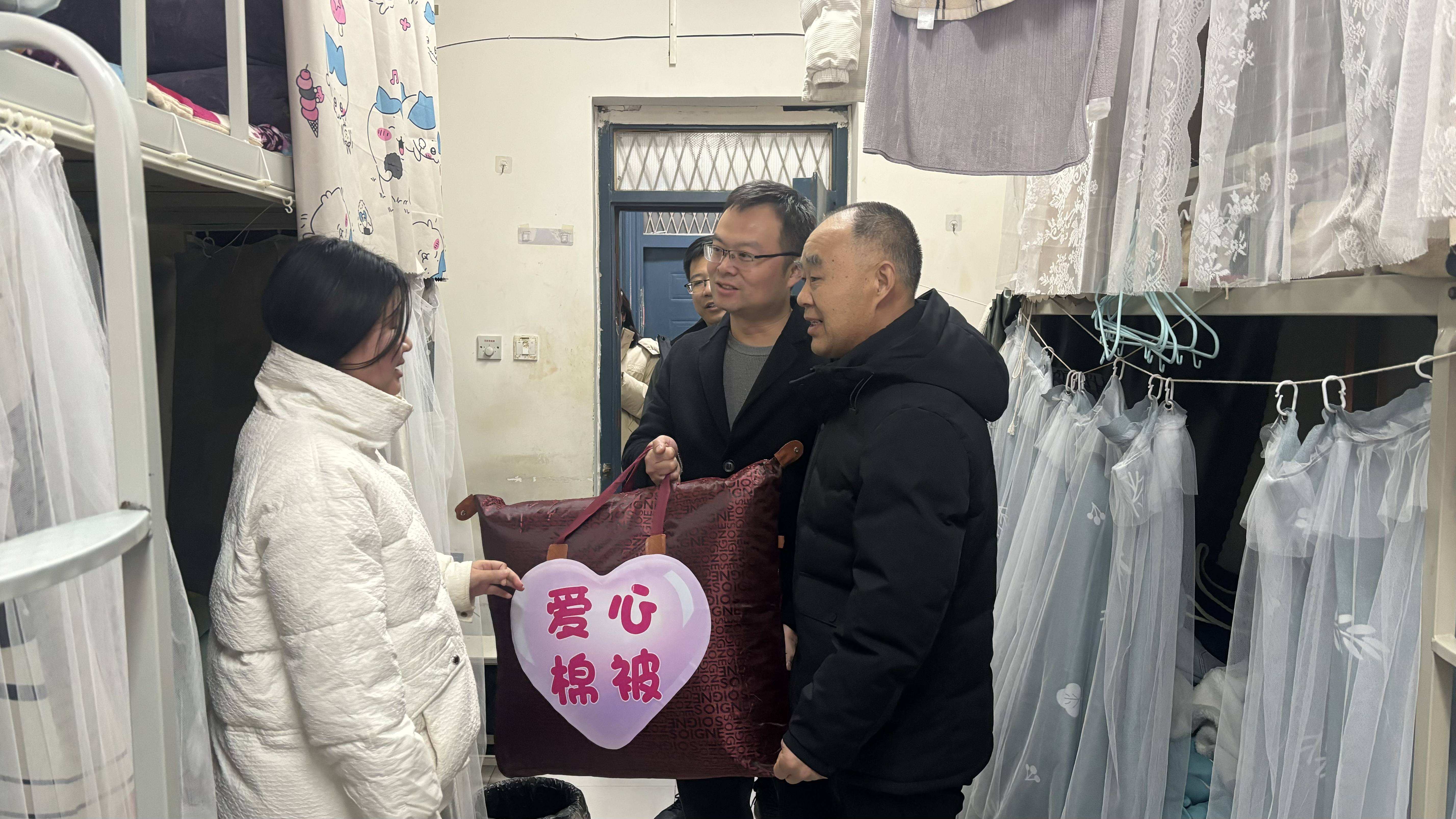 副校长刘效平在医药学院党总支书记张亮及相关工作人员的陪同下,深入医药学院学生宿舍为家庭经济困难学生送去爱心棉被。走访过程中,刘效平与学生们亲切交谈,询问她们的学习生活情况,了解她们在宿舍生活中遇到的问题和困难。医药学院的教师们也纷纷与学生互动,认真倾听学生心声、面临的困难和对未来的规划。刘效平鼓励同学们要坚定信念,努力学习,积极面对生活中的挑战,现场气氛热烈而温馨。