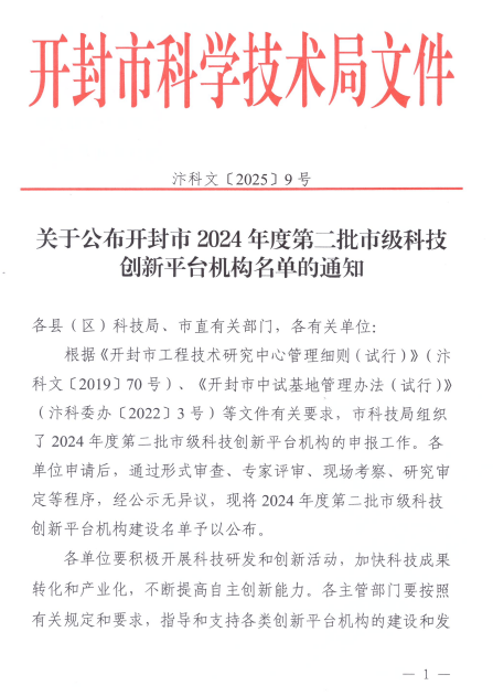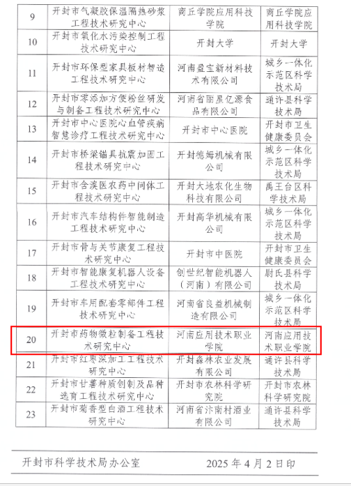 近日,开封市科学技术局公布了“开封市第二批科技创新平台机构拟认定名单”,在学校相关部门和兄弟单位的大力支持下,我校药物微粒制备工程技术研究中心被认定为“开封市药物微粒制备工程技术研究中心”。该中心联合上海金不换兰考制药有限公司、河南大学共建,标志着我校在药物微粒制备技术领域实现教育链、创新链与产业链的深度融合,为开封市培育战略性新兴产业注入新动能。