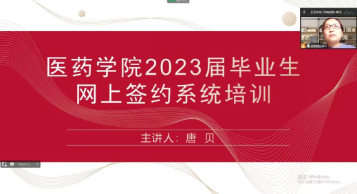 2023年2月23日晚上,医药学院通过腾讯会议召开了2023届毕业生网上签约系统培训会议。毕业班辅导员及全体毕业生参会,会议由学工办主任唐贝主持。